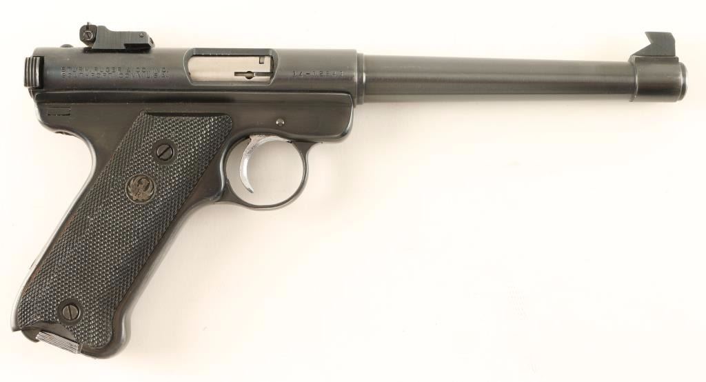 Hammerless semi-automatic target pistol chambered in .22 Long Rifle, circa 1977. Features a blued finish, heavy 7" tapered barrel, large blade front sight, adjustable rear sight, serrated wide trigger, manual safety, 10 round magazine and checkered black plastic grips with Ruger medallion in right grip panel. Pistol shows moderated edge wear with 90% bluing intact. Action is smooth, bore is excellent and grips are good & very good. Condition is very good. ***Modern Firearm***