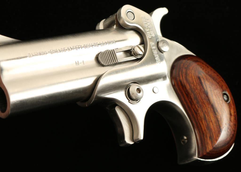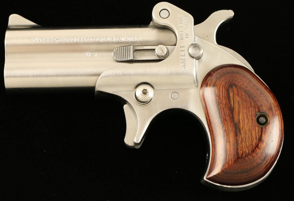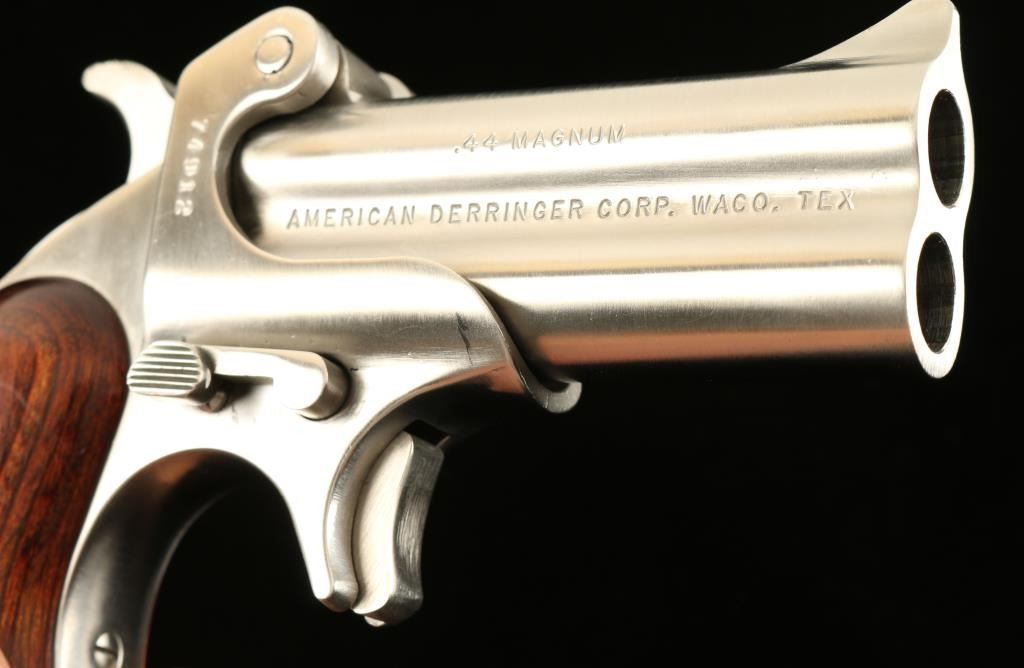 Stainless steel double barrel over & under derringer chambered in .44 Magnum. Features a brushed finish, 3" barrels, fixed sights, spur trigger, push button safety, manual extractor, serrated hammer spur, and two piece laminated wood grips. Derringer shows light use with few fine scratches and wear from the barrel release lever rubbing on the frame, Action is sound, bores are very good and grips are fine. Condition is very good++. ***Modern Firearm***