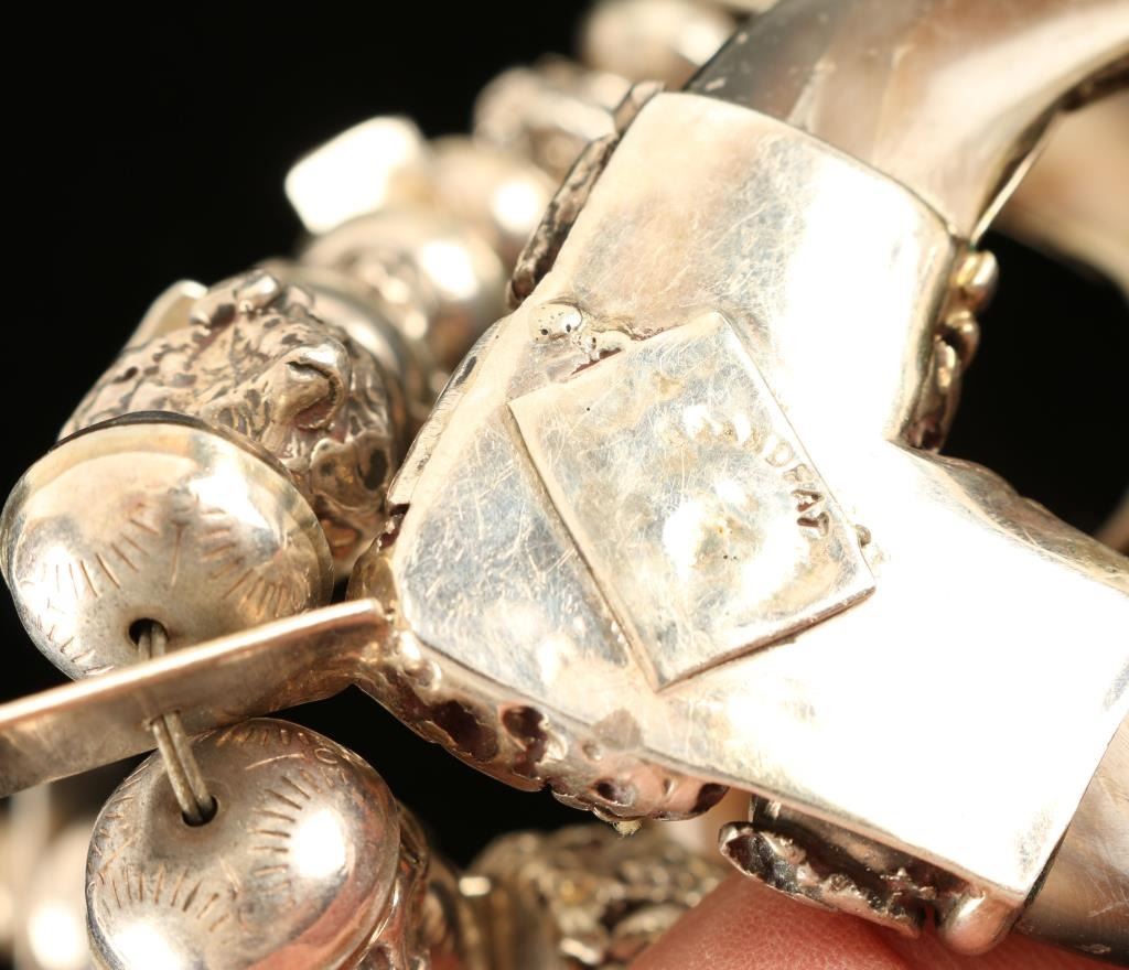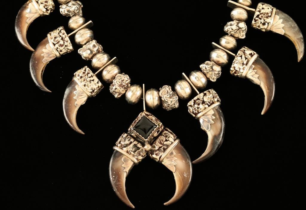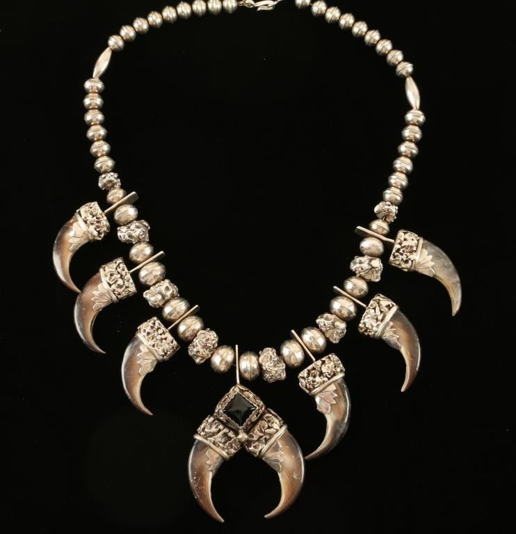 Beautiful large bear claw necklace with 8 bear claws accented with a square cut onyx stone. All set in sterling silver accented with silver beads. Pendant is stamped 'Grandfather' on back. Can not be sold to state of California.