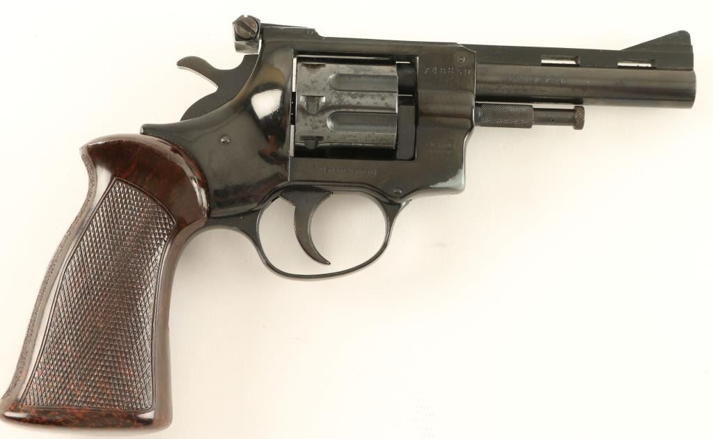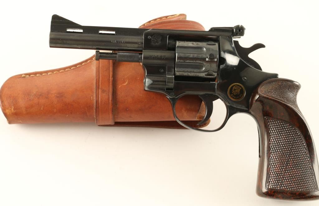 German made double-action target revolver chambered in .22 Long Rifle. Features a black finish, 4" ribbed barrel, ramped front sight, adjustable rear sight(missing window), flat top frame, fluted eight shot cylinder, serrated trigger & hammer spur, and two piece checkered faux wood target grips. Includes a brown leather belt loop holster by Viking. Revolver shows light scattered surface rust emerging on the cylinder & barrel and high edge wear on the bottom of the frame forward of the trigger guard. Action performs well, bore is excellent and grips are fine. Condition is near good. ***Modern Firearm***
