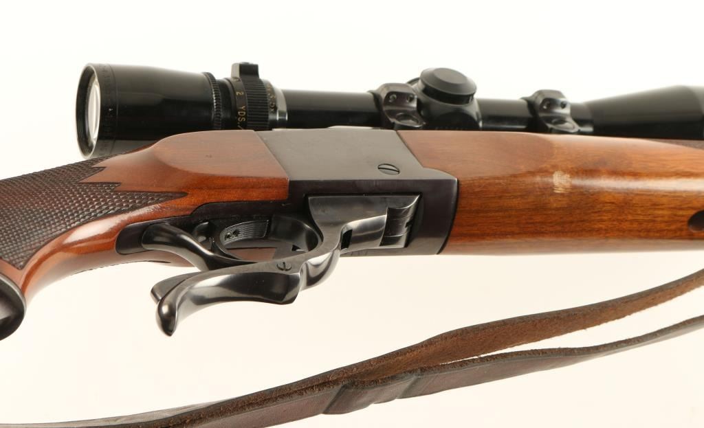 Falling block single-shot sporting rifle chambered in 7x65R, circa 1978. Features a blued barrel, 26" Marquart Precision barrel, ramped & hooded front sight, omitted rear sight, Leupold Vari-X III 3.5 x 10x scope, serrated trigger, sliding tang safety, brown leather sling, metal pistol grip cap with brass medallion and two piece checkered walnut stock with rubber recoil pad. Rifle exhibits 95% finish with light even wear and receiver turned plum. Action is very smooth, bore is excellent and wood stocks are near fine with minimal imperfections. Condition is near excellent. ***Modern Firearm***