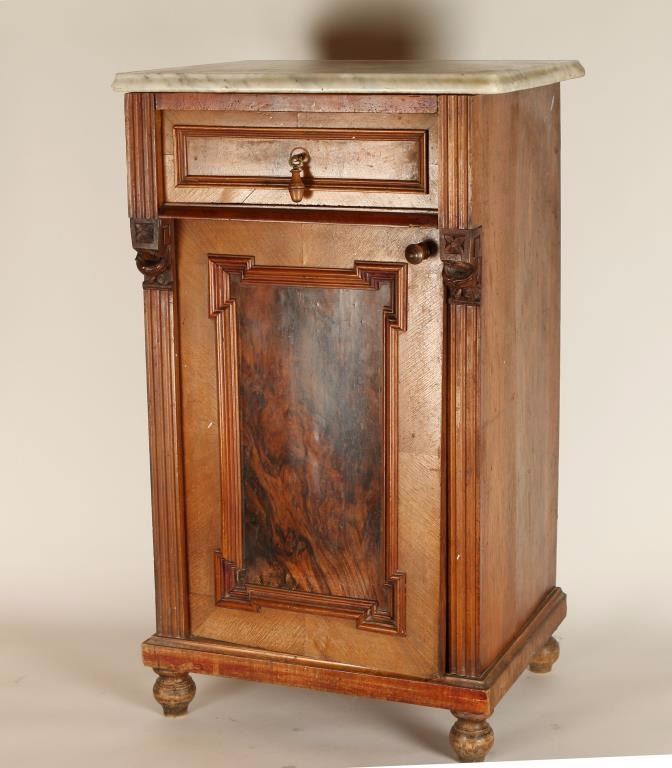 Burled wood on door, 1920's- 30's era. Pretty carved floral and nest details just under marble top. One shelf in cabinet. Measures 32"x19"x15".