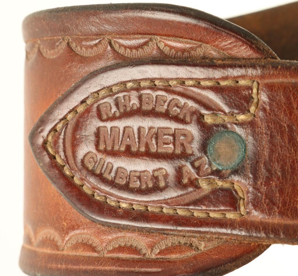 Made by R.H. Beck, smooth brown leather accented with a stamped scalloped design. Maker marked on belt and holster. Made in Gilbert, AZ. 44" to center hole.