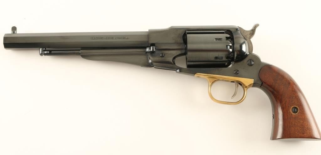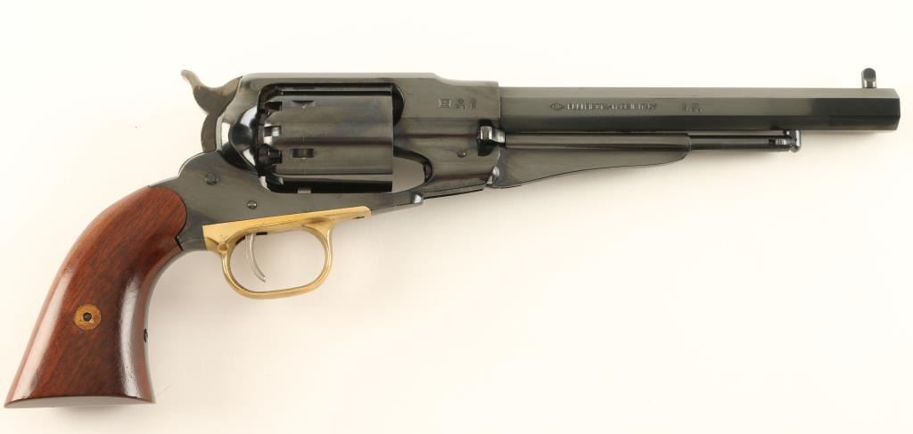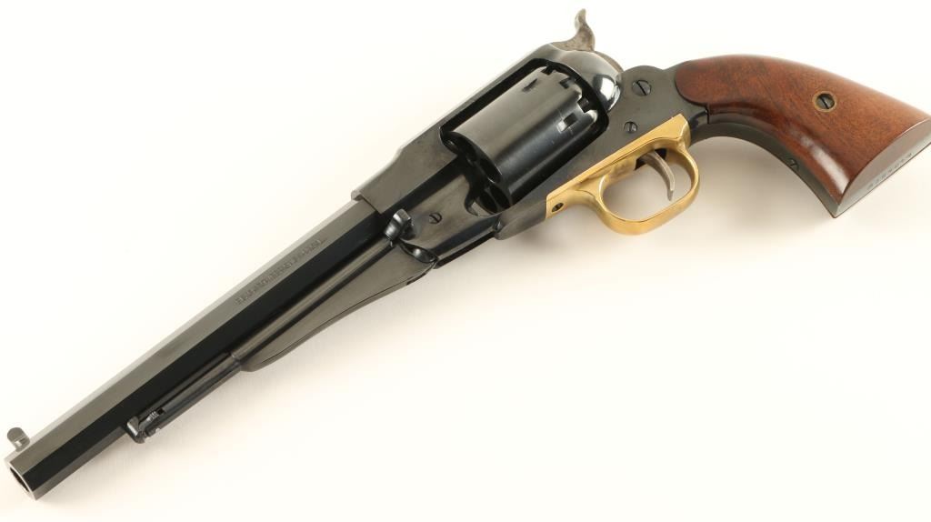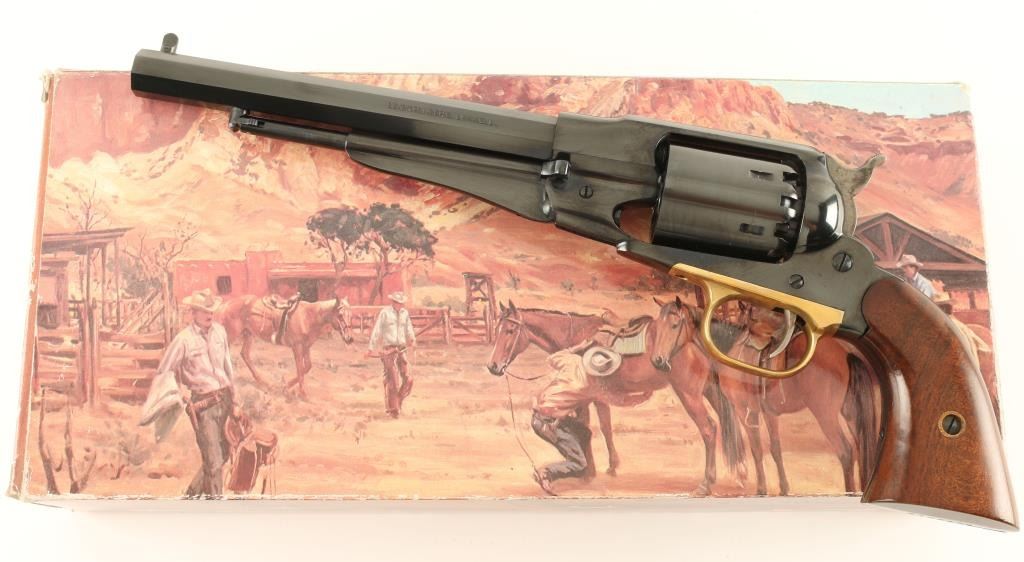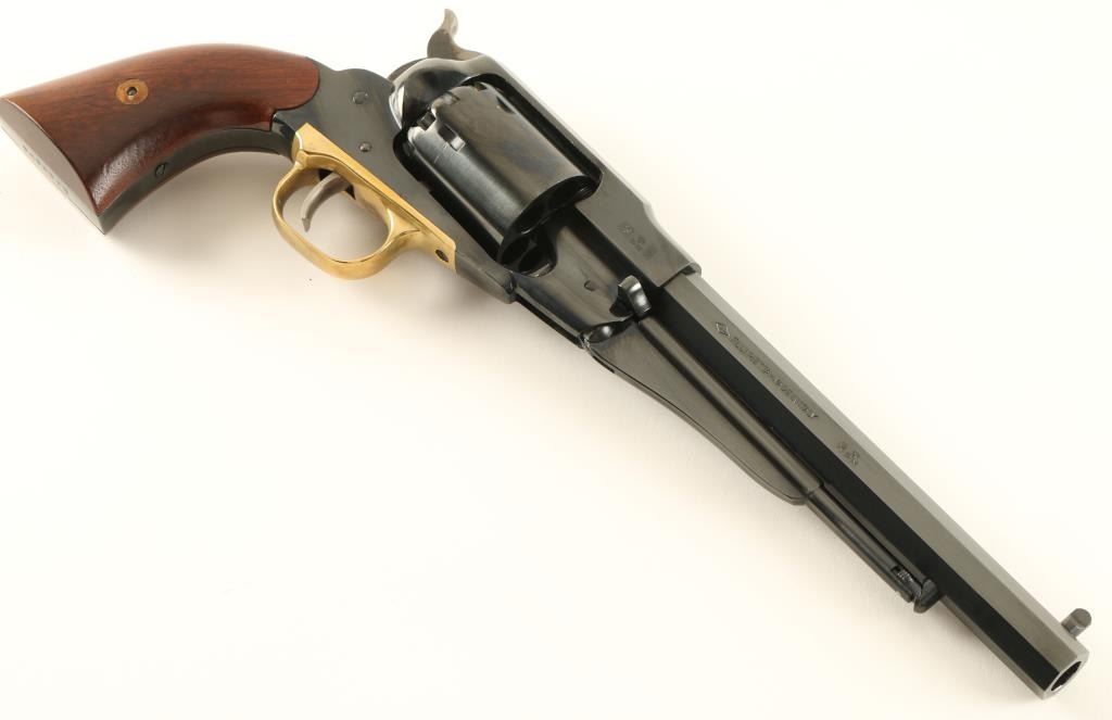Italian copy of the Remington 1858 New Model Army single action percussion revolver in .44 Caliber. Features a blued finish, 8" octagonal barrel, pinched post front sight, notched rear sight, loading lever, non-fluted six shot cylinder, smooth trigger, brass trigger guard, case hardened hammer with serrated spur, and two piece smooth wood grips. Includes original factory box with correct label. Revolver shows little to no wear. Action is smooth, bore is excellent and grips are fine. Condition is like new in box. ***Antique Firearm***