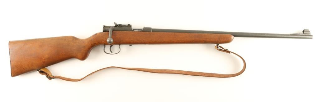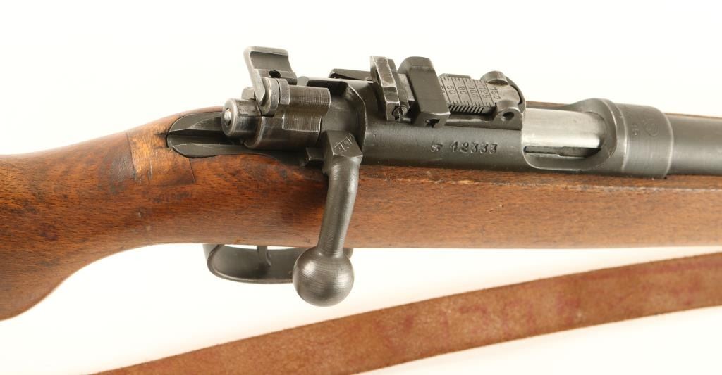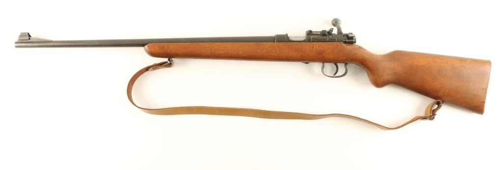 French military magazine fed bolt action training rifle chambered in 5.5mm. Features a parkerized finish, 24" tapered barrel, ramped & hooded front sight, graduated rear aperture sight to 150 meters, no magazine, Mauser style bolt release & safety, tan leather sling and plain pistol grip wood stock with metal buttplate. Non-matching serial numbers on receiver and bolt. Rifle retains approximately 80% of it's parkerized finish with light wear and moderate scuffs. Action is smooth, bore is excellent and wood stock is good showing a repair to the near of the receiver. Condition is good to very good. ***Modern Firearm***