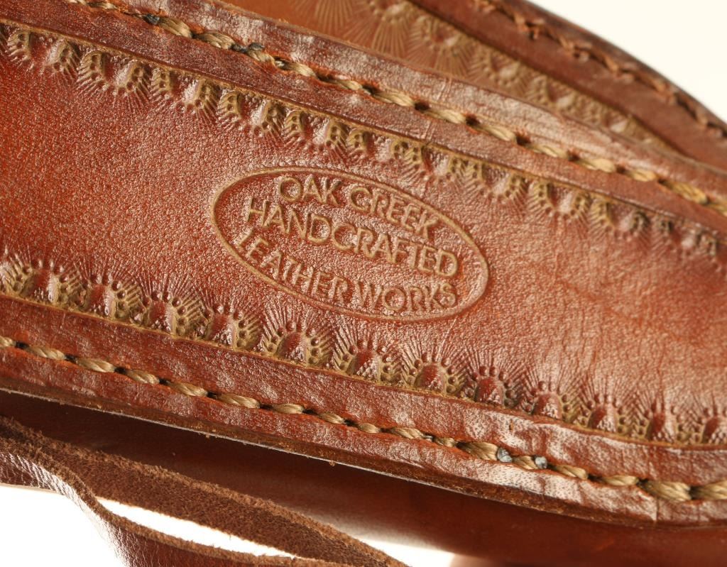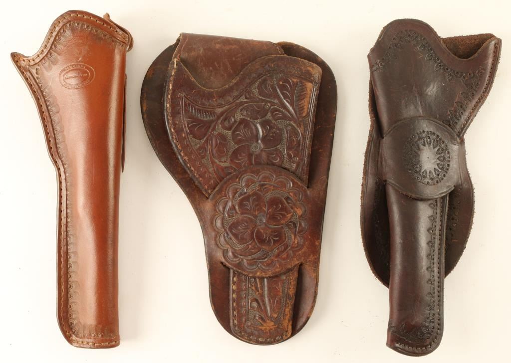Including a single loop floral tooled holster, stamped single looped Slim Jim holster, and a brown leather Oak Creek holster.