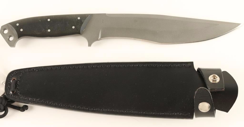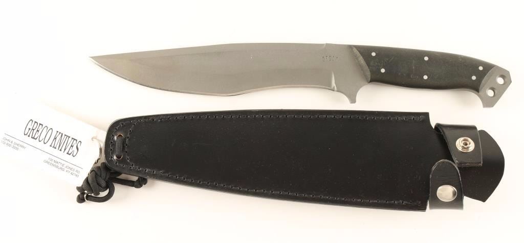 It's made of 1/8" stock, but feels like an extension of your hand, making it very "fast." It's stamped GRECO on one side of the tang and the mysterious number "5" on the reverse side. It's full-tang with butt drilled out for a lanyard. Grip is ergonomic and can be used in traditional and reverse grip. Excellent lines in the design and blade is hollow ground, razor sharp right to the point. Well-made sheath of thick black leather. The blade is covered in an anti-glare that is effective, but unknown to me. Measures 14" overall with a 8 1/2" blade.