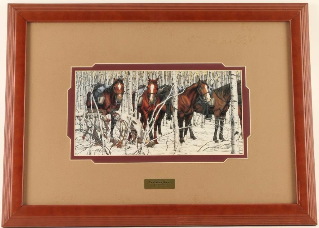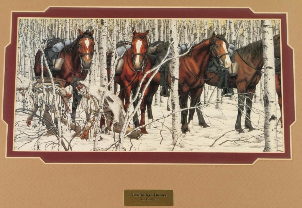 by noted artist Bev Doolittle entitled Two Indian Horses, nicely doubled matted and framed, image size is 13X7"