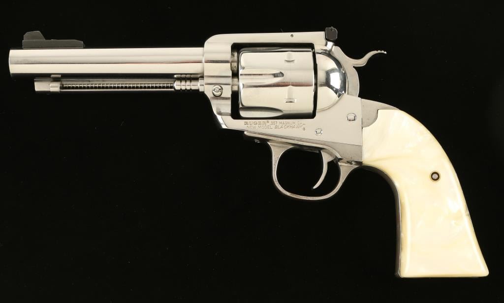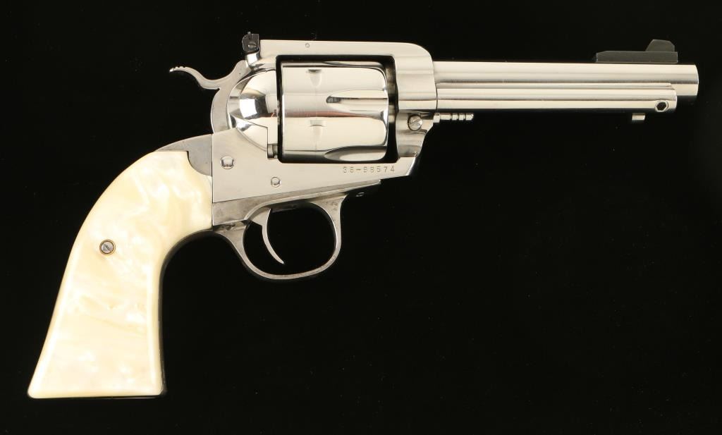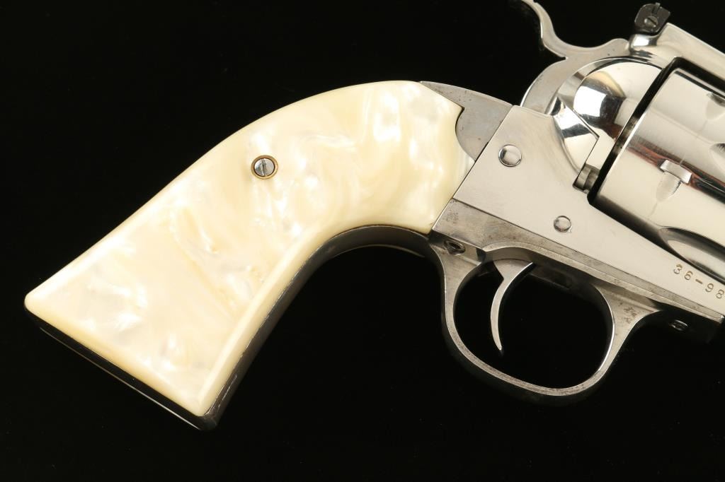 Stainless steel single action revolver chambered in .357 Mag & modeled after the Colt Bisley Model. Features a polished finish, 5.5" barrel, blade front sight, adjustable rear window sight, flat top frame, fluted six-shot cylinder, transfer bar safety, smooth trigger, serrated hammer spur and faux mother-of-pearl grips. Revolver shows light to moderated handling wear with many fine superficial scratches. Action is crisp, bore is excellent and grips are fine. Condition is very good+. ***Modern Firearm***
