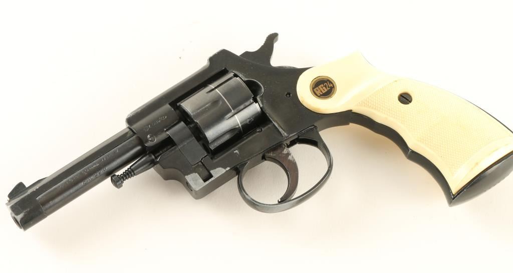 German made double action revolver chambered in .22 LR. Features a black finish, 3.5" barrel, fixed sights, fluted six shot cylinder, alloy frame, serrated hammer spur and off white checkered plastic grips. Revolver shows some high edge wear with approximately 80% finish intact. Action is sound, bore is bright and grips are good. Condition is very good. ***Modern Firearm***