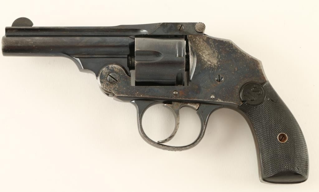 SN: 45718 Concealed hammer double action revolver chambered in .38 S&W, manufactured by Iver Johnson circa 1910-1935. Features a blued finish, 3.25" ribbed barrel, blade front sight, notched rear sight, fluted five shot cylinder, case hardened smooth trigger and checkered black hard rubber grips. Revolver exhibits approximately 60% of it's blued finish, showing flaking on the left side of the frame and cylinder with heavy wear and light surface rust on the backstrap. Action performs well, bore is very good and grips show an old repair the the left panel. Condition is good. ***Modern Firearm*** ***C&R Firearm***