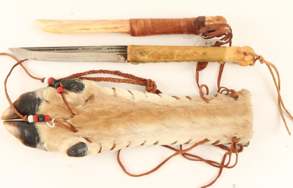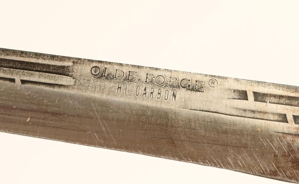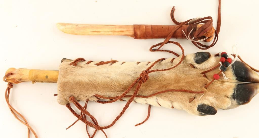 1 deer bone with leather wrapped handle, and 1 deer leg sheath with bead and leather accents-includes rawhide wrapped bone handle knife which measures 12 1/2" overall with a 6 1/4" blade that has an embossed design and is stamped 'Olde Forge Hi Carbon'.