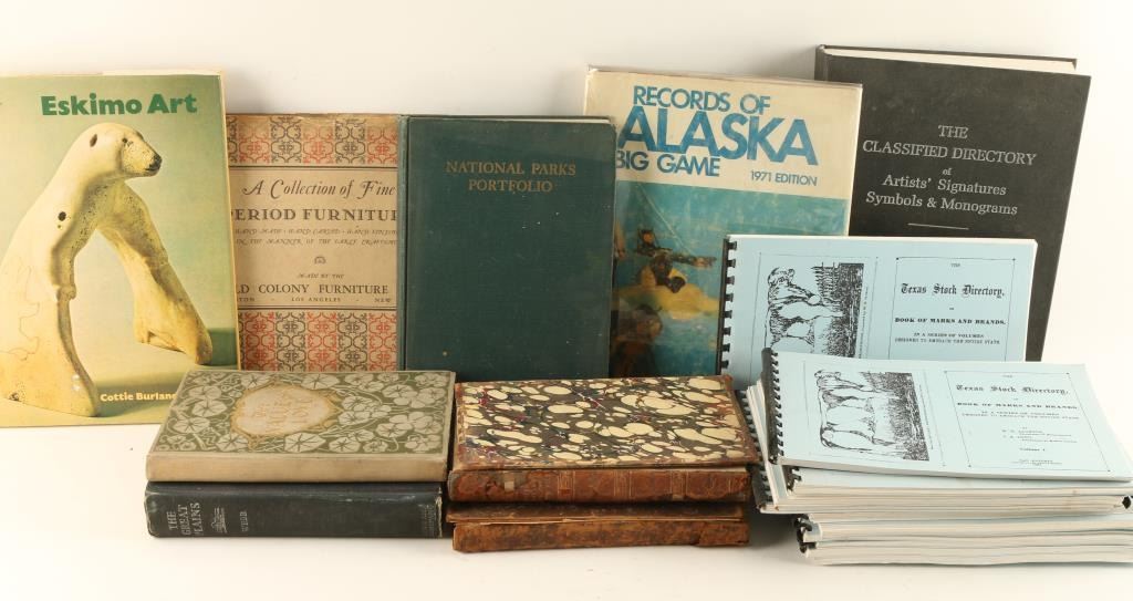 Including; "A Collection of Fine Period Furniture" by Old Colony Furniture Company 1936, "The Great Plains" by Walter Prescott Webb 1931, "Voyage of Discovery The North Pole" by Captain F.W. Beechley, RN, FRS, "Texas Stock Directory" by W.H. Jackson 1843, "Eskimo Art" by Cottie Burland, and many more! In poor to fair condition, some older volumes are coming apart.
