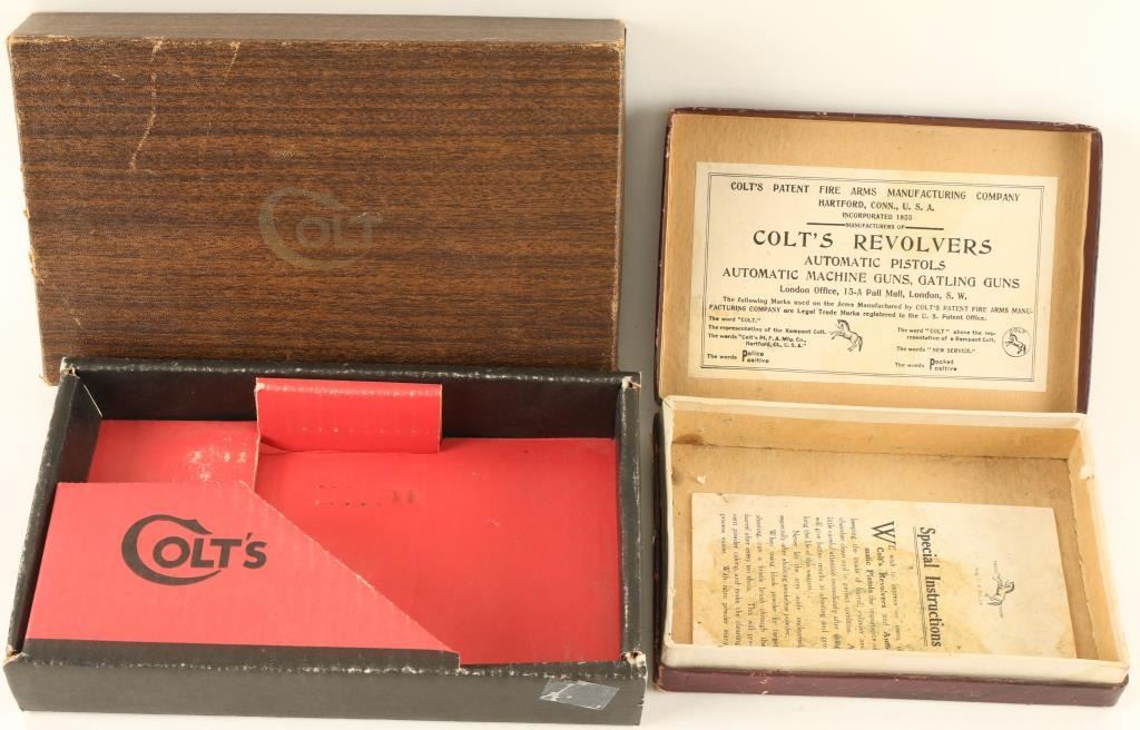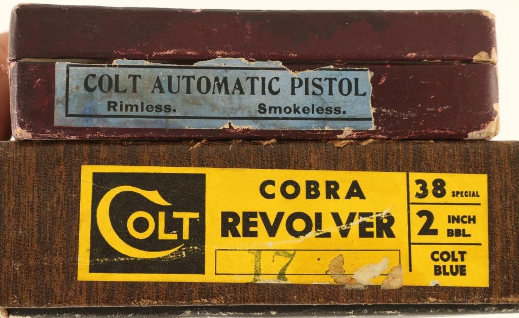 Including a Colt 380 cardboard box with original label inside, and a Colt Cobra woodgrain box for the 2" barrel.
