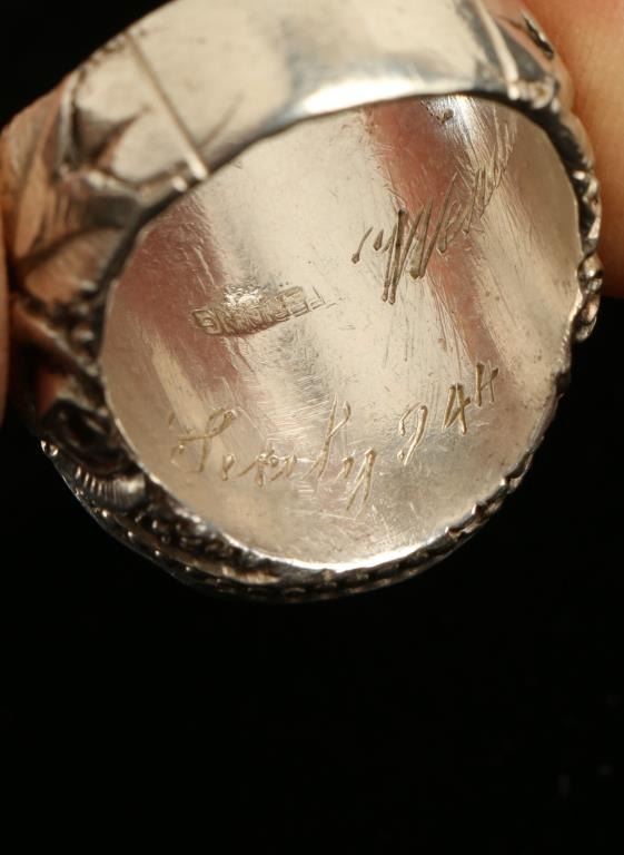set in sterling with rose engraved design, inside of ring is signed by the artist. Very high quality ring set.