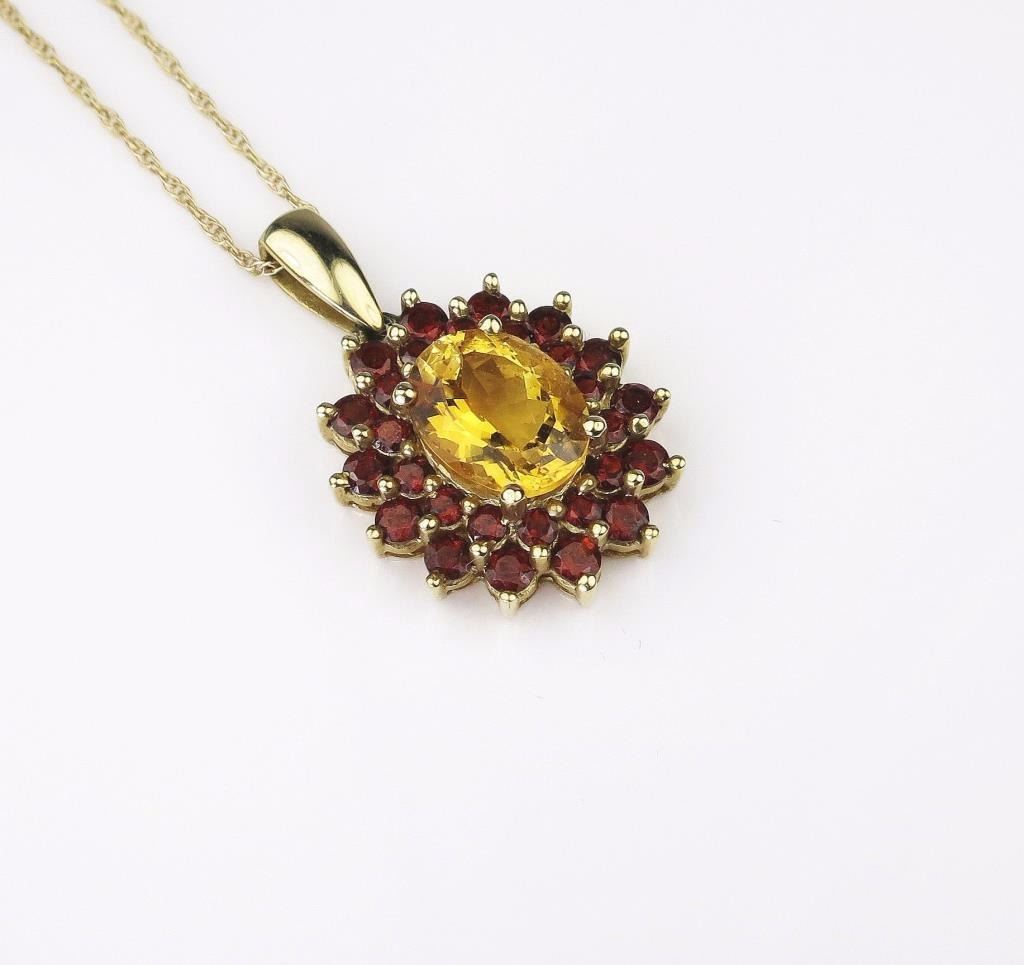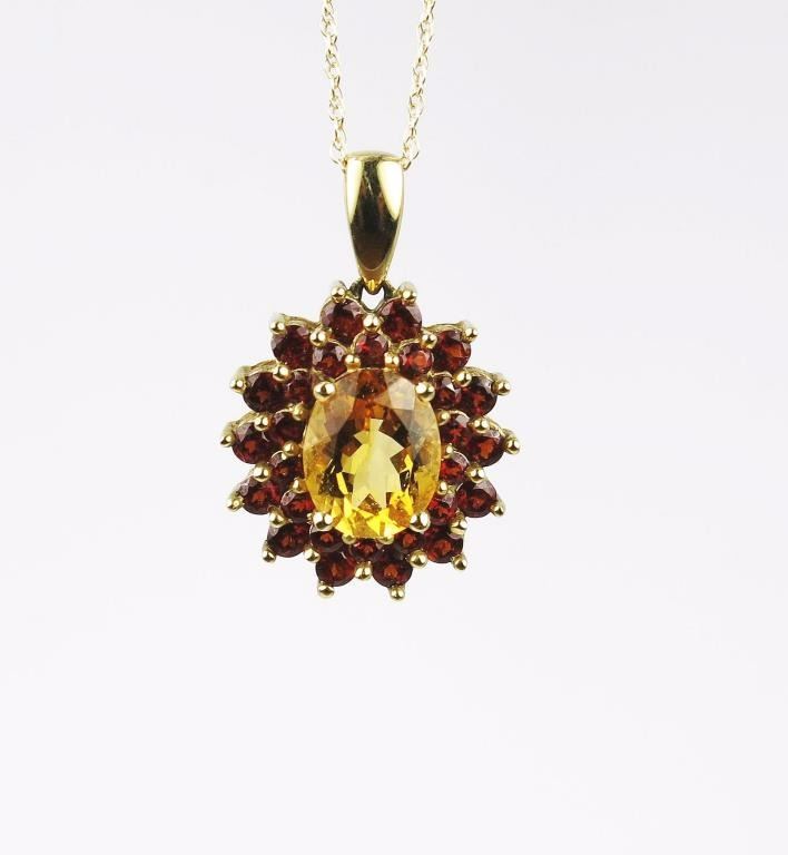 Set with an oval Citrine weighing approx. 3.00 carats and surrounded by 30 round Garnets weighing approx. 2.00 carats set in 10 karat yellow gold setting.