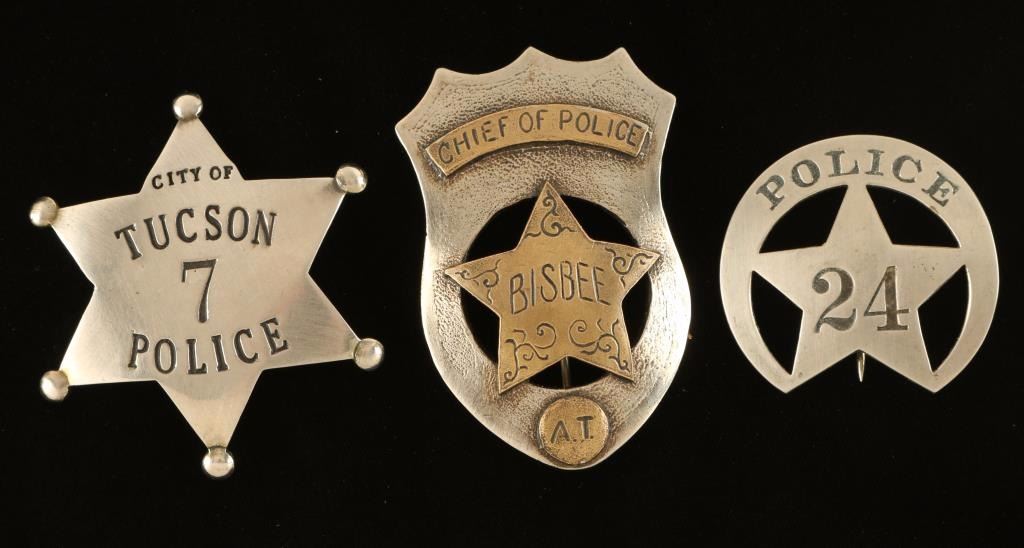 All of which are quality reproductions, Chief of Police Bisbee A.T., City of Tucson Police badge, and one other police badge.