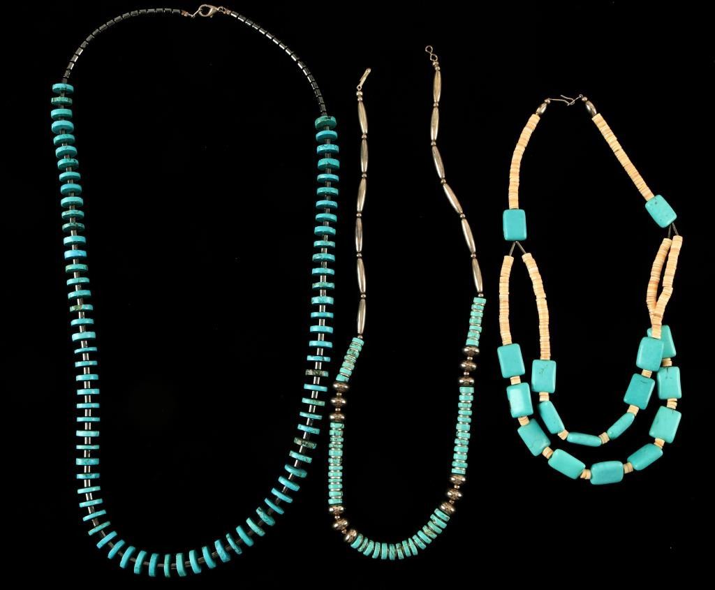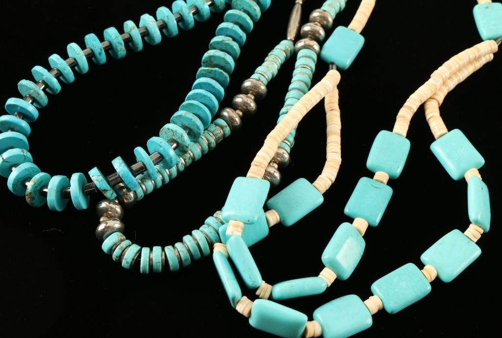 1 turquoise discs with alternating silver discs and beads, 1 turquoise 'Chiclet' shaped stones with alternating shell discs, and 1 turquoise discs with alternating oblong hematite beads.