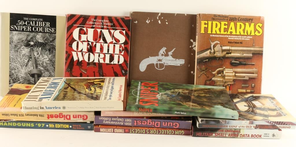 Including: "Illustrated Encyclopedia of 19th Century Firearms" by Major F Myatt MC, "The Complete Handgun 1300 to Present" by Ian V Hogg & John Battchelor, "The Greenhill Military Small Arms Data Book" by Ian V Hogg, "Hunting in America" by Charles F Waterman, "Sniper" by Mark Spicer, "Shooting Lever Guns of the Old West" by Mike Venturino signed by author, "Shooting Sixguns of the Old West" by Mike Venturino, and many more!