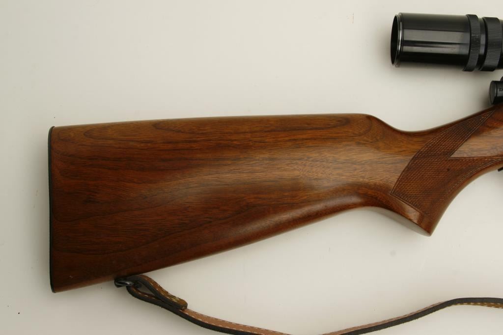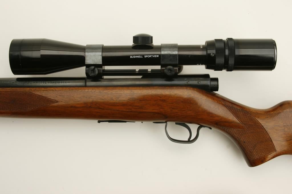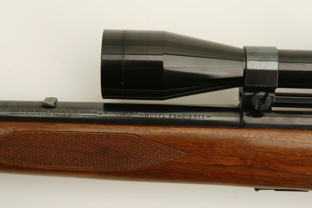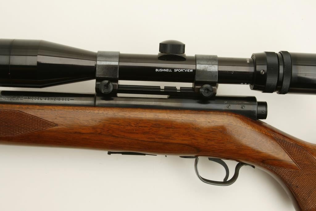 218 Bee caliber, 24” round barrel, checkered wood stock, S/N 24522A, in overall fine condition as restored; mounted with a Bushnell Sportview scope displaying crisp optics; also with leather sling. (C&R). Est.: $600-$1,200.