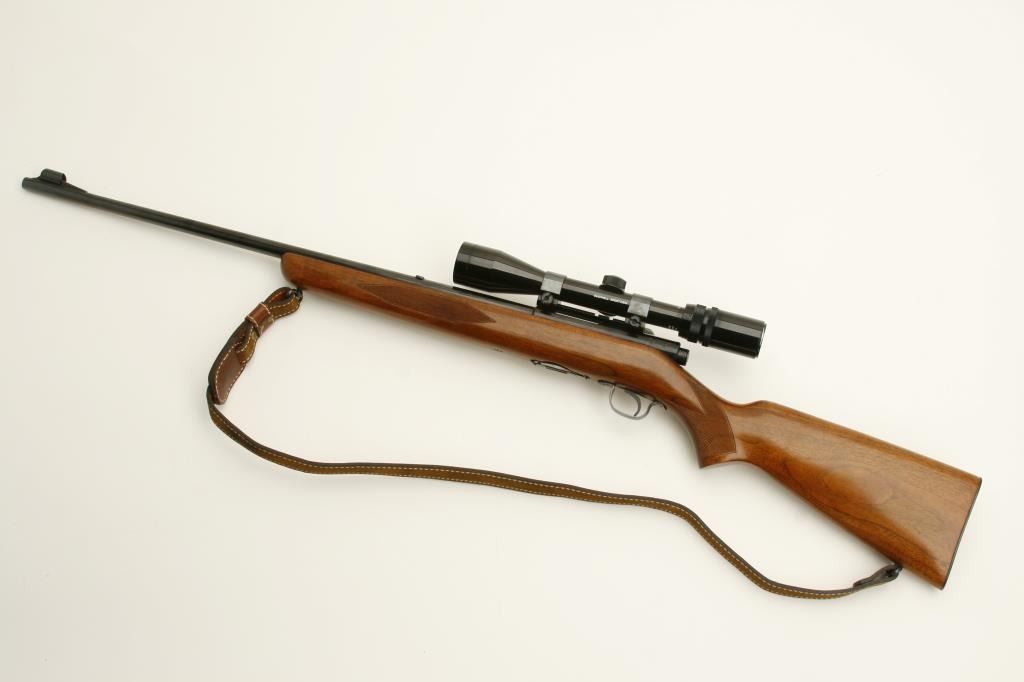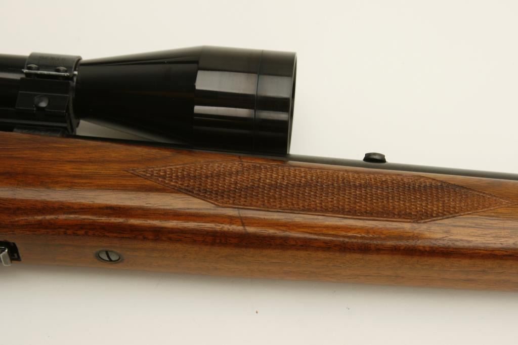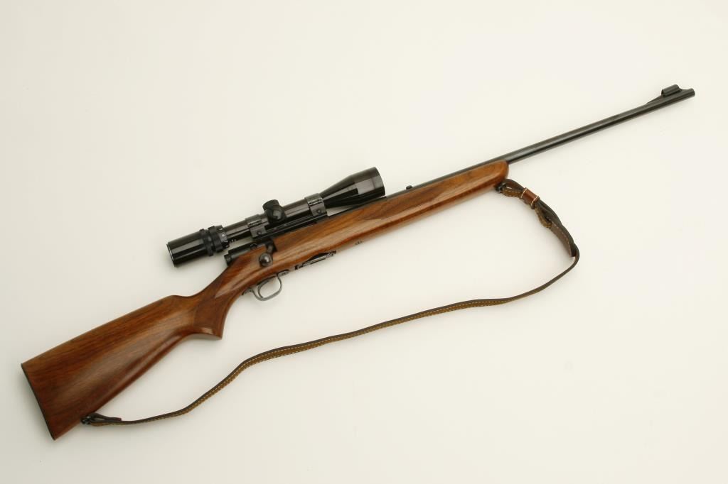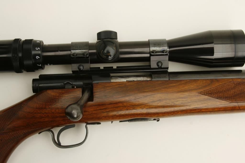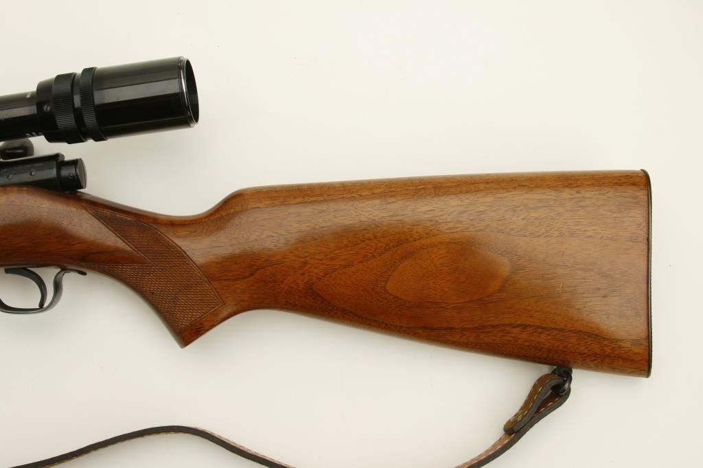 218 Bee caliber, 24” round barrel, checkered wood stock, S/N 24522A, in overall fine condition as restored; mounted with a Bushnell Sportview scope displaying crisp optics; also with leather sling. (C&R). Est.: $600-$1,200.