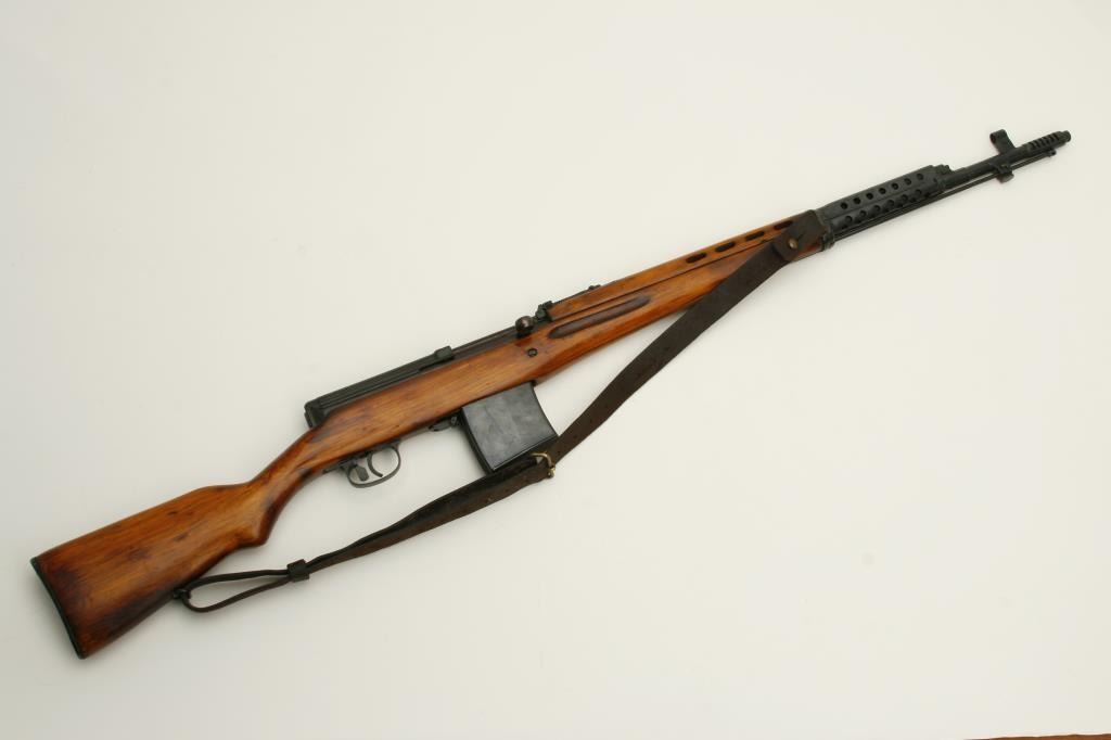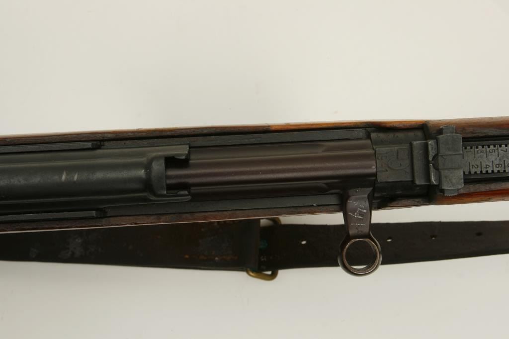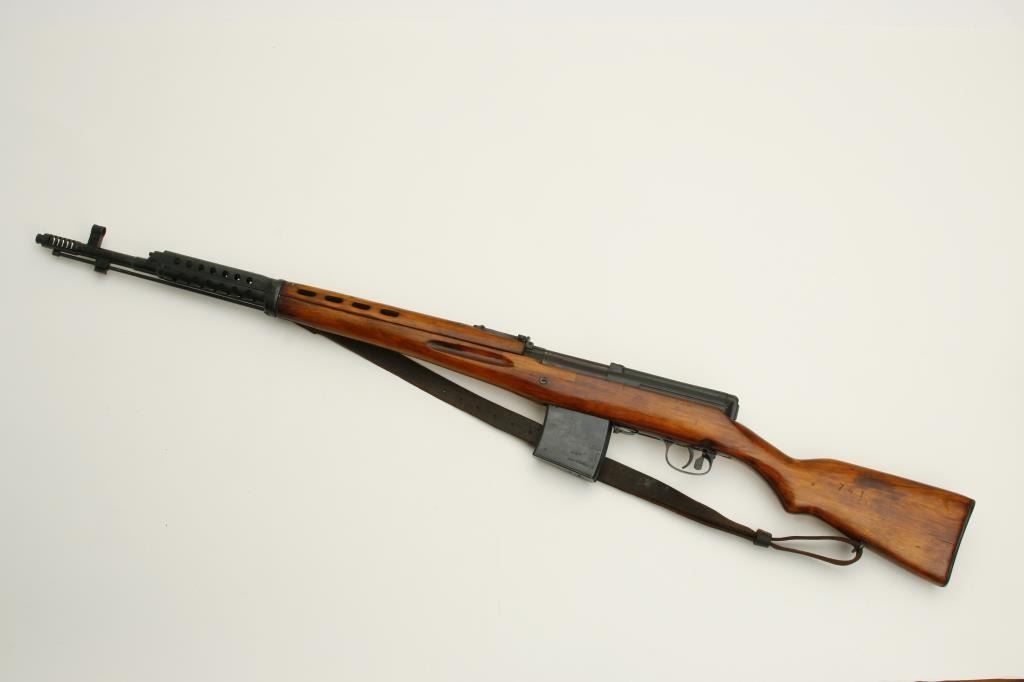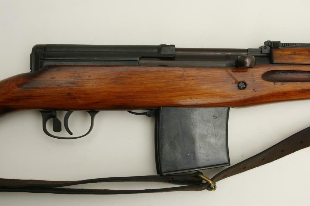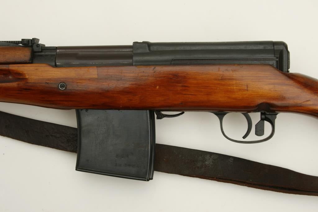 serial #3A741. The rifle is in very good overall condition with a 26” barrel, hooded post front and tangent rear sights. The barrel and receiver retain nearly all of their military finish, with the receiver stamped with the date 1941. The smooth wood stocks are in very good condition as well showing only minor handling marks. The butt stock ends with a smooth, metal butt plate. The rifle includes sling swivels and a period military leather sling. The bore is good, the action is crisp and markings are sharp on this World War II vintage Soviet rifle. This model was referred to as the Russian version of the M1 Garand. (C+R) Est.: $700-$1,400.