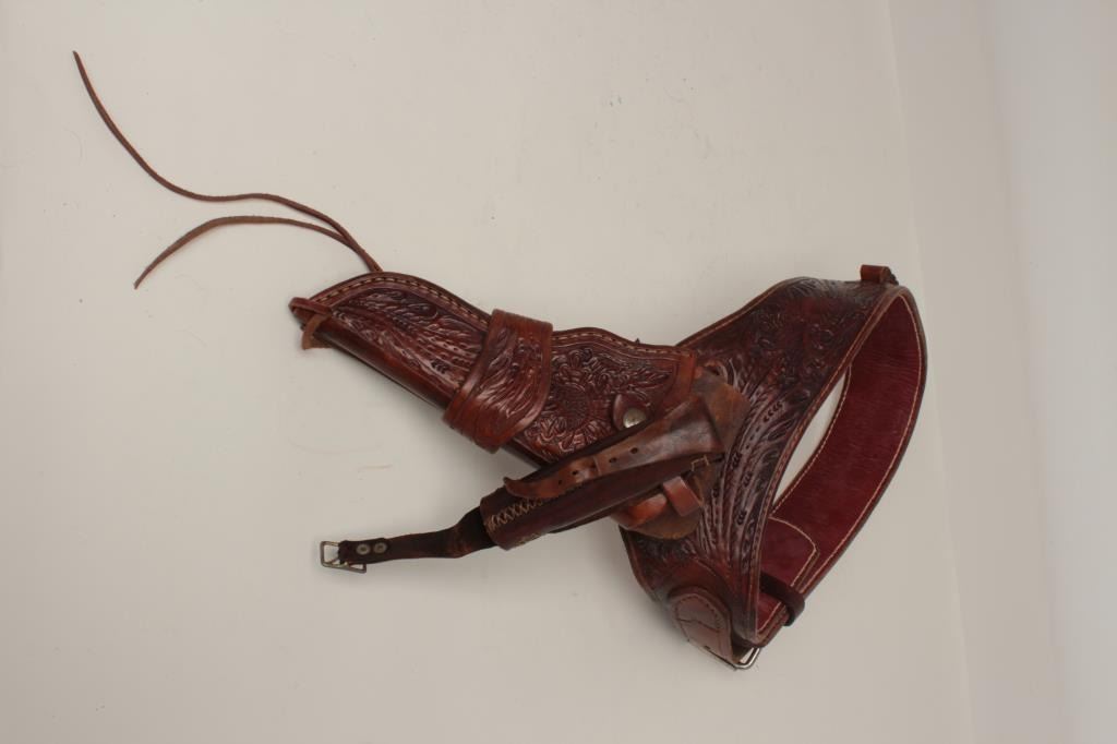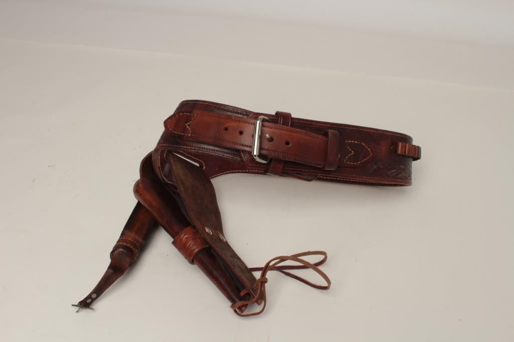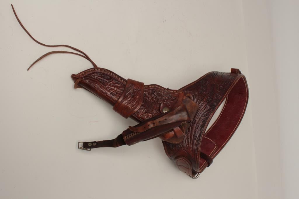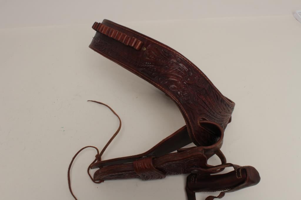 Lot 599 Custom handmade tooled leather Western holster and cartridge