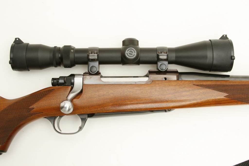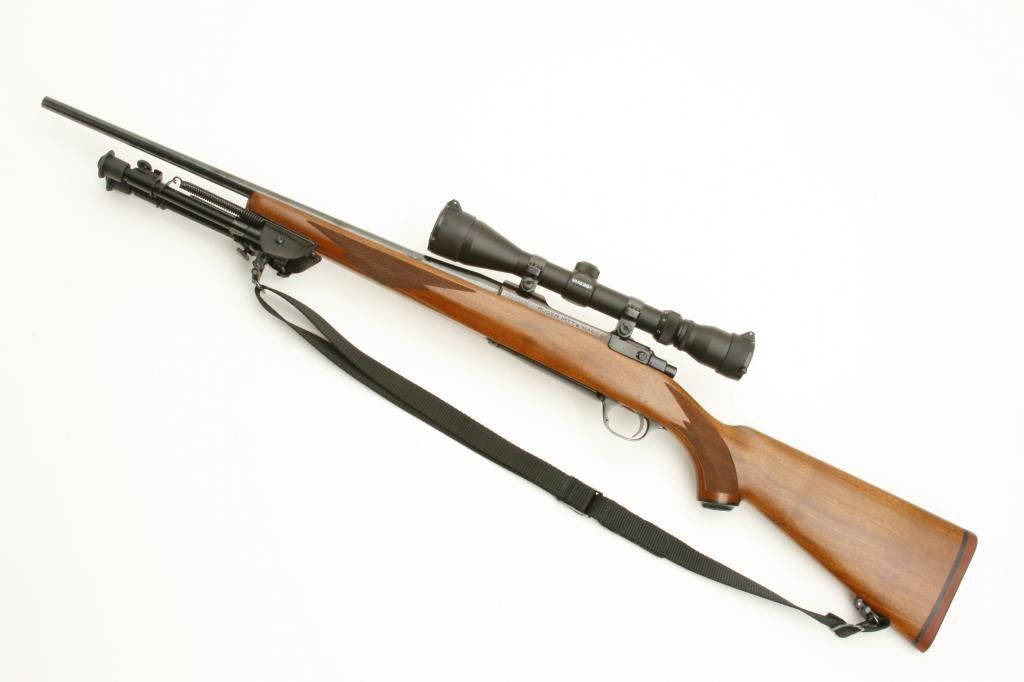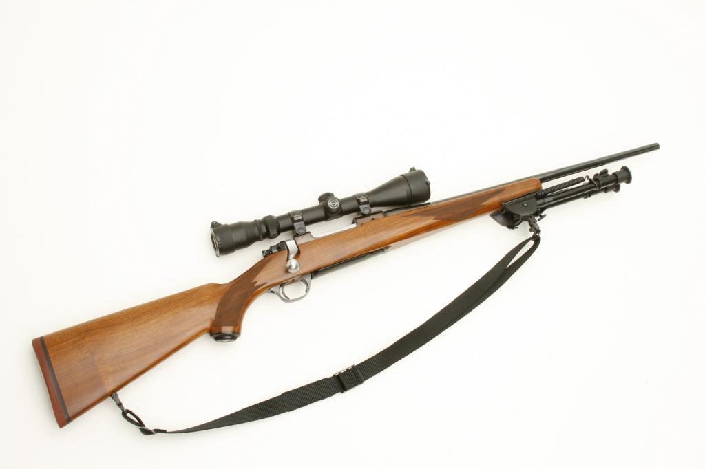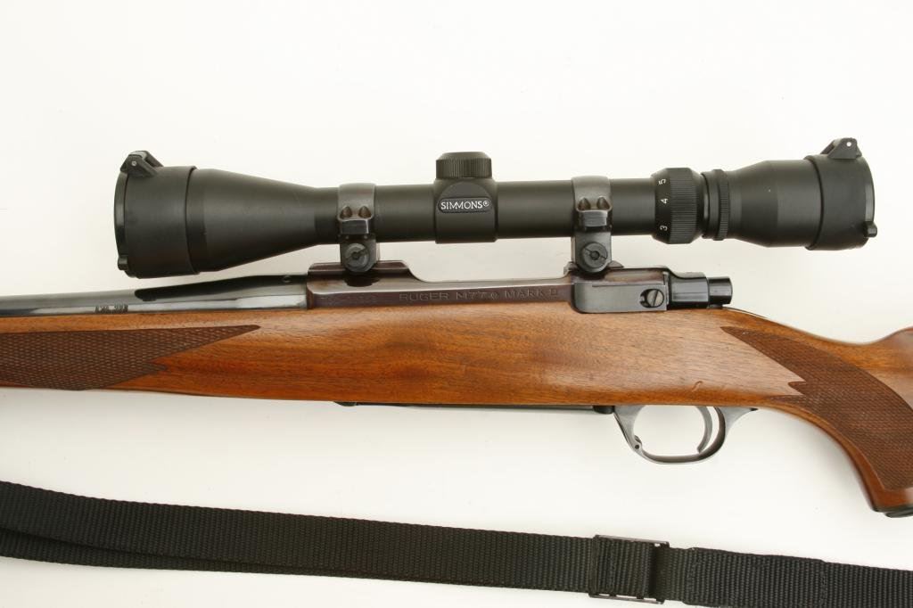 caliber, serial #780-01359. The rifle is in very good condition with a 20” blued barrel. The barrel and action retain nearly all of their blued finish with only slight handling marks noted. The rifle has a Harris style bi-pod added. The smooth wood stock is in very good condition as well with sharp checkering and a red rubber Ruger marked recoil pad added. The bore is very good, the action crisp and markings are sharp. The rifle has Ruger proprietary rings and a Simmons 3x9x40 variable power scope with crisp, clear optics and a nylon sling added. (Modern) Est.: $300-$600.