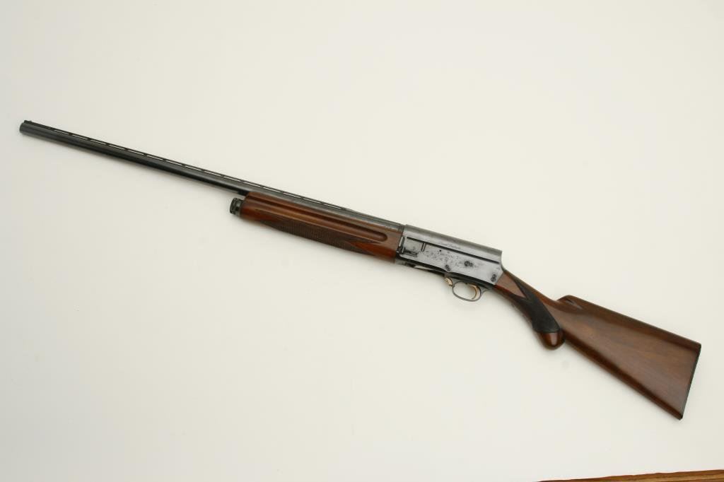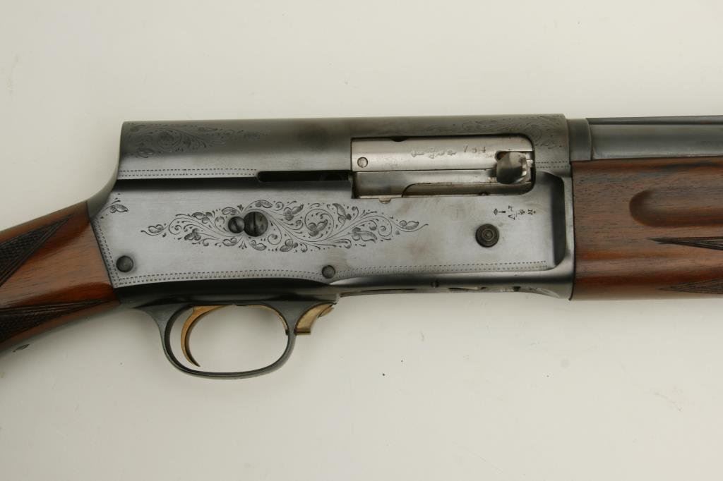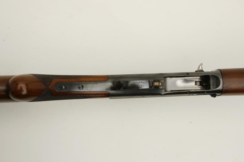 serial #X4854. The shotgun is in excellent overall condition with a 27” barrel with a filed, full-length ventilated rib and steel bead front sight. The barrel and receiver show nearly all of their original blued finish with scroll engraving on the action and tang. The checkered wood stocks are in excellent condition as well with Prince of Wales pistol grip and an FN marked horn butt plate. The butt plate has suffered a small chip at the toe. The bore is very good, the action crisp and markings are sharp on this beautiful, old Browning. (C+R) Est.: $600-$1,200.