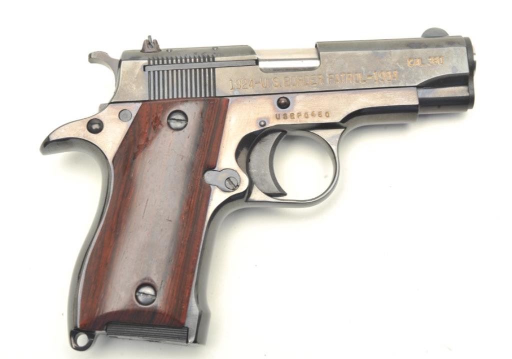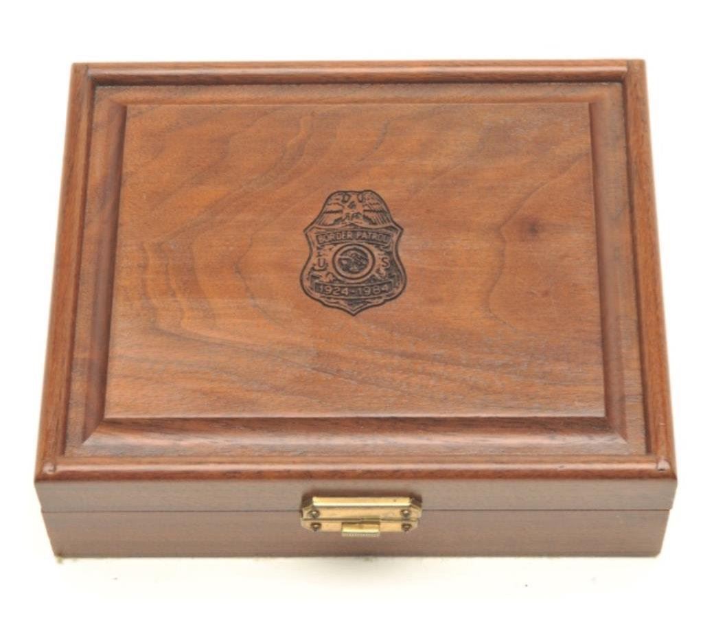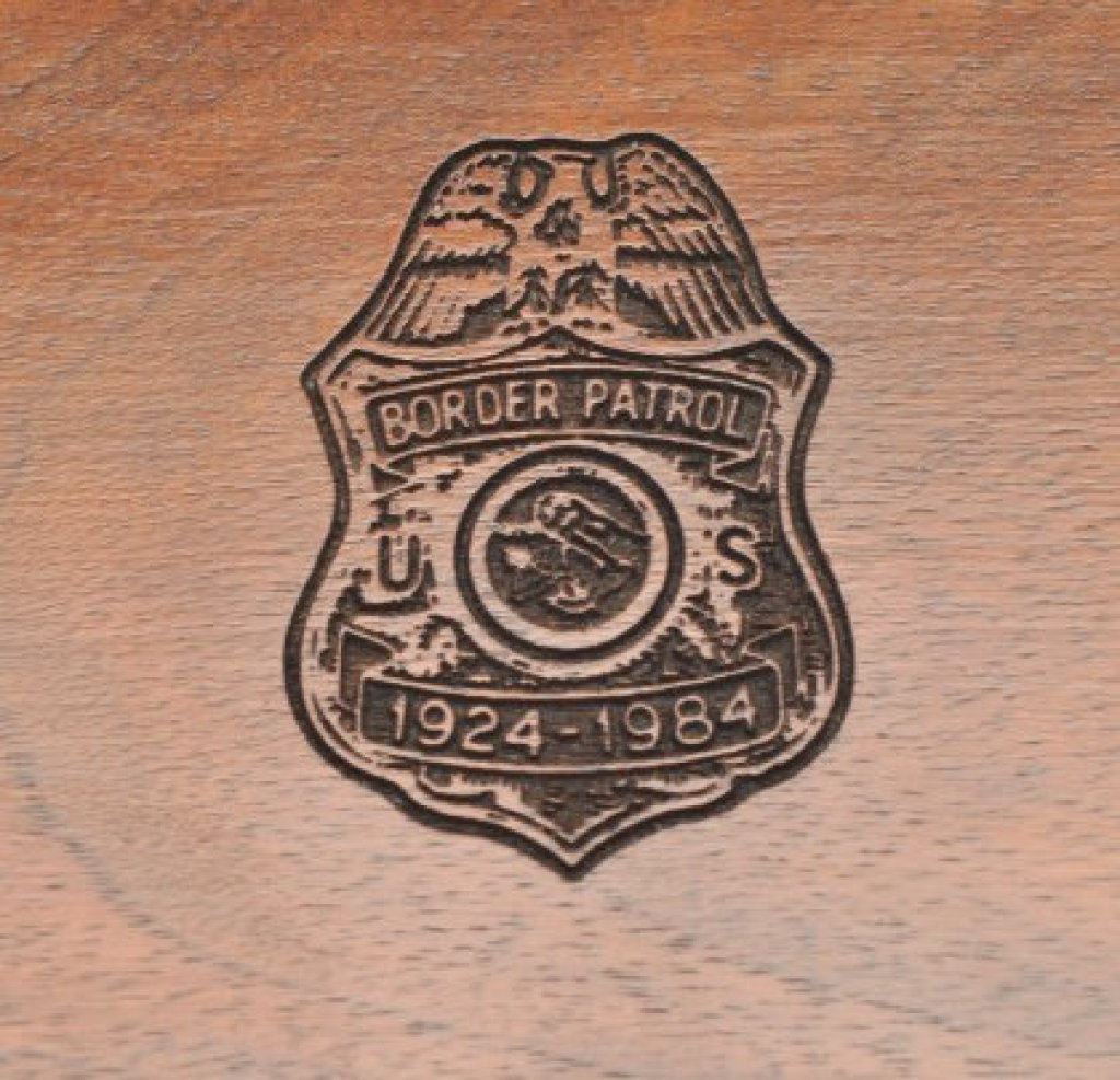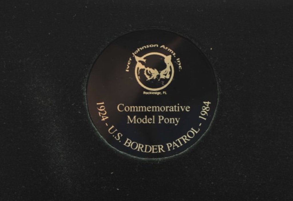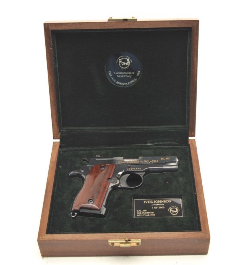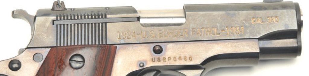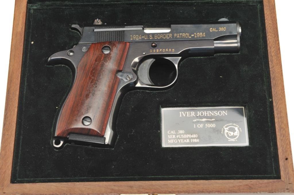Border Patrol Commemorative (1924-1984) semi-automatic pistol, .380 caliber, 3.25” barrel, blued finish with gold accented markings, wood grips, S/N USBP0480 (1 of 5,000), in overall excellent condition. The casing displays descriptive plaques on the interior and laser cut Border Patrol emblem on the exterior of the lid. (Modern/PPT). Est.: $700-$1,400.