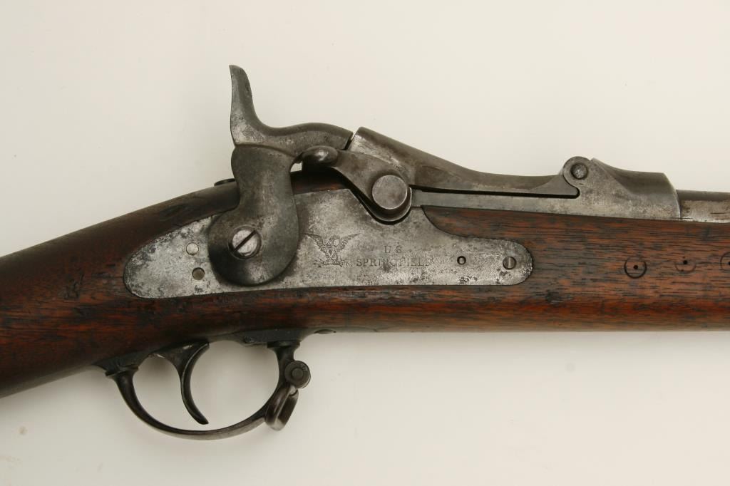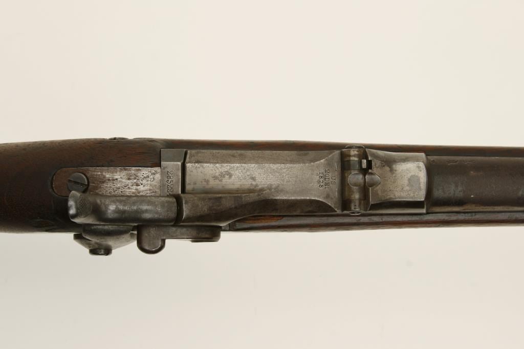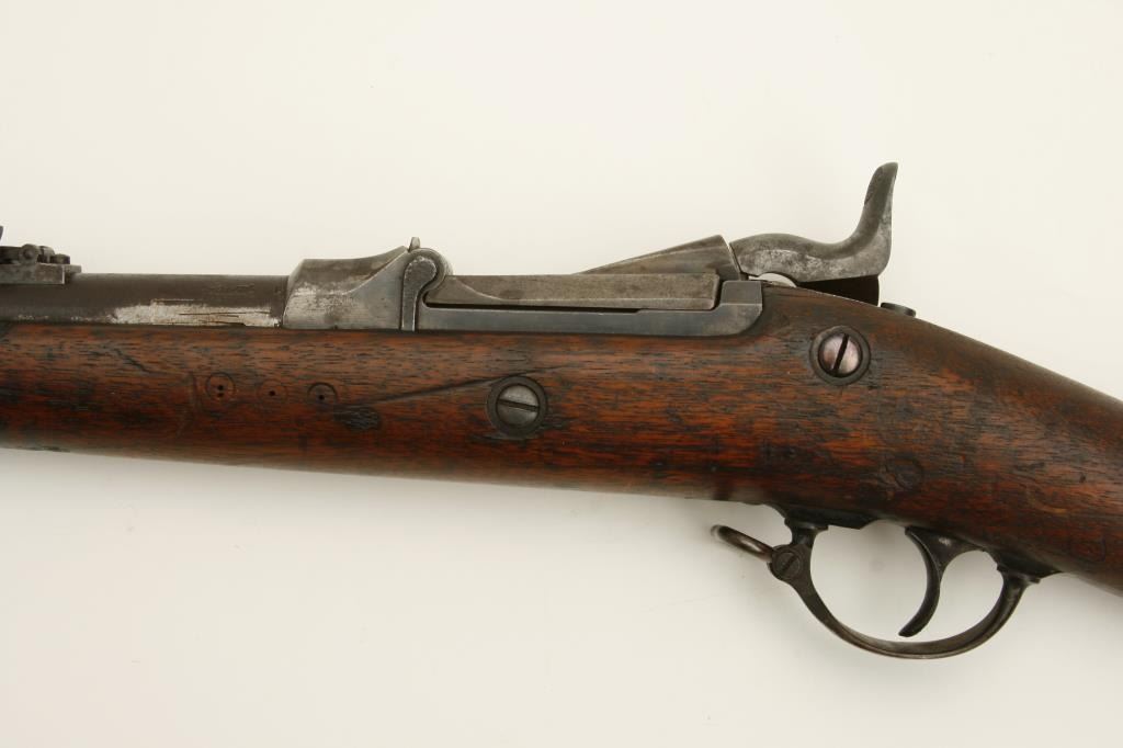 The carbine is in good overall condition with a 22” barrel. The carbine was created by cutting down a Springfield Trapdoor rifle. The barrel and action have gone primarily to patina with the side still reading “U.S. Springfield”. The smooth wood stock has seen considerable use and has numerous dents and compressions. The right side of the butt stock is marked, “56” and has numerous tack holes noted. The butt ends with a smooth metal butt plate. The bore is fair, the action functions and markings are legible. (Antique) Est.: $250-$500.