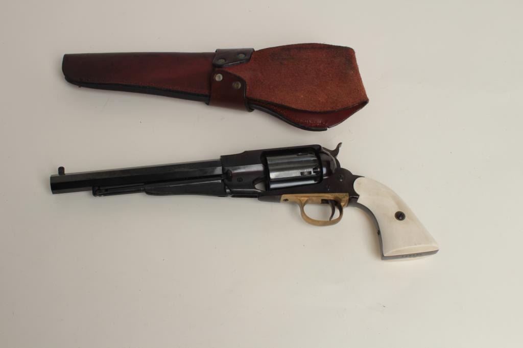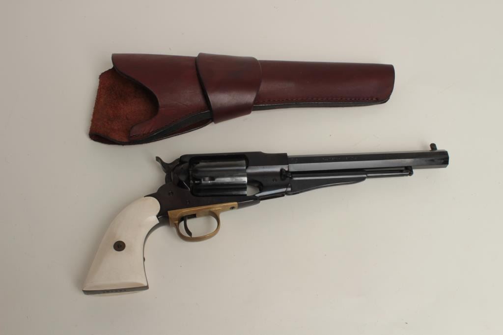 percussion revolver, .44 caliber, blued finish, simulated ivory grips, S/N 186196, in near new condition and with a brown leather holster. (Percussion). Est.: $125-$250.