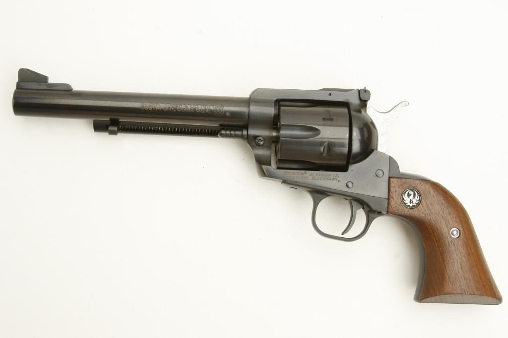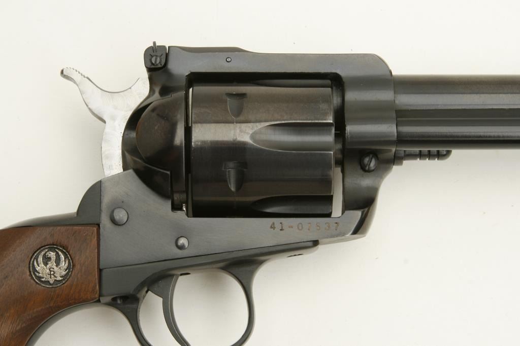 Magnum caliber, 6.5” barrel, blued finish, jeweled hammer, wood medallion grips, S/N 41-07537, in near new condition overall. (Modern/PPT). Est.: $300-$600.