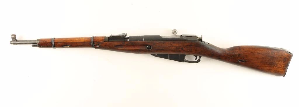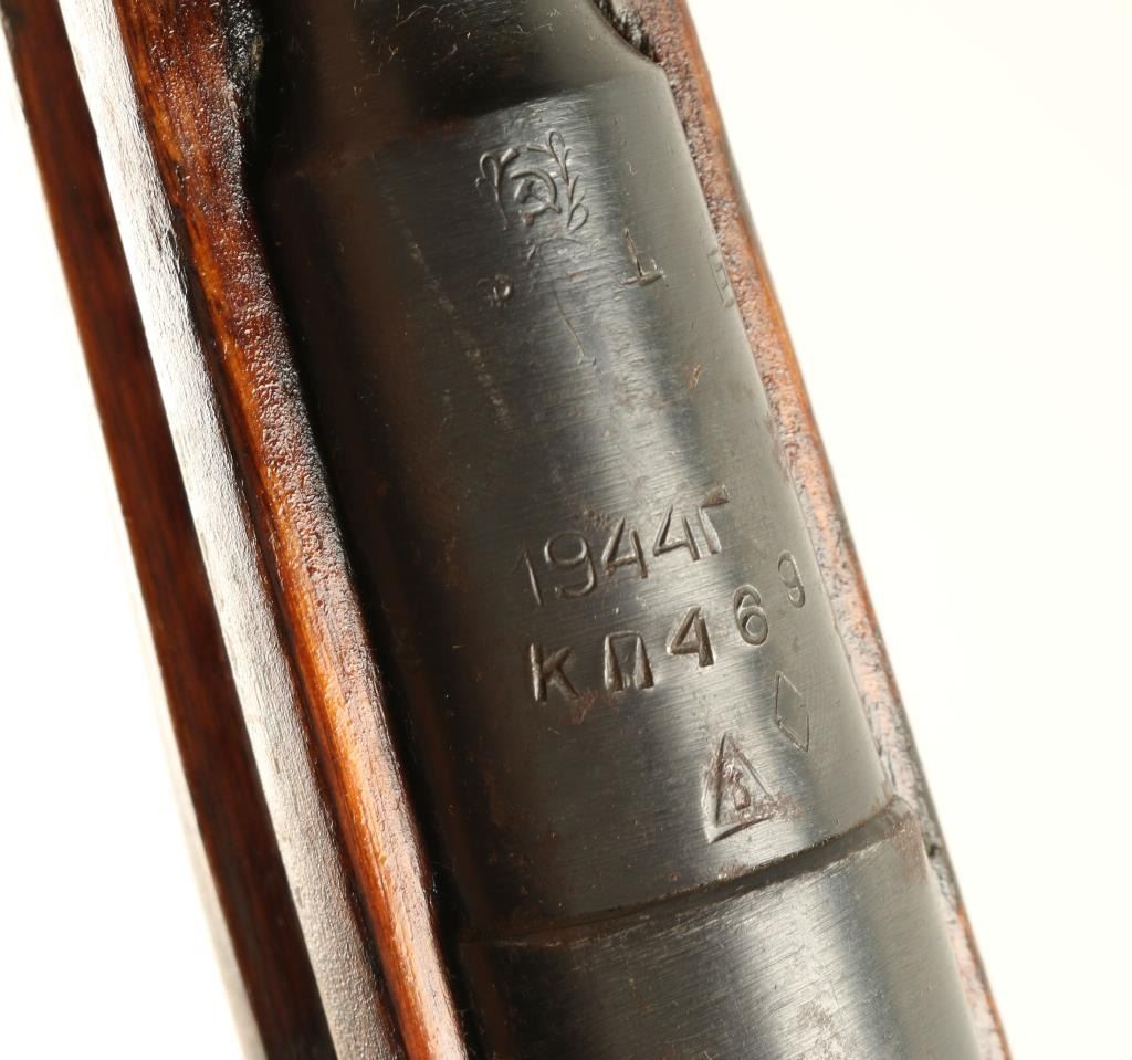 Reconditioned Russian military bolt action service rifle chambered in 7.62x54R, circa 1944. Features a blued finish, Izhevsk marked 20" barrel, hooded post front sight, graduated rear sight to 1,000 meters, two barrel bands, 5 round fixed magazine, straight bolt handle, smooth wood handguard and straight grip shoulder stock with metal buttplate. Matching serial numbers on barrel, floorplate, buttplate, receiver & bolt. Import marks on barrel. Rifle retains approximately 80% of it's blued finish showing light scattered surface rust on all metal parts. Action performs well, bore is very good and wood stocks are very good. Condition is good+. ***C&R Firearm*** ***Modern Firearm***