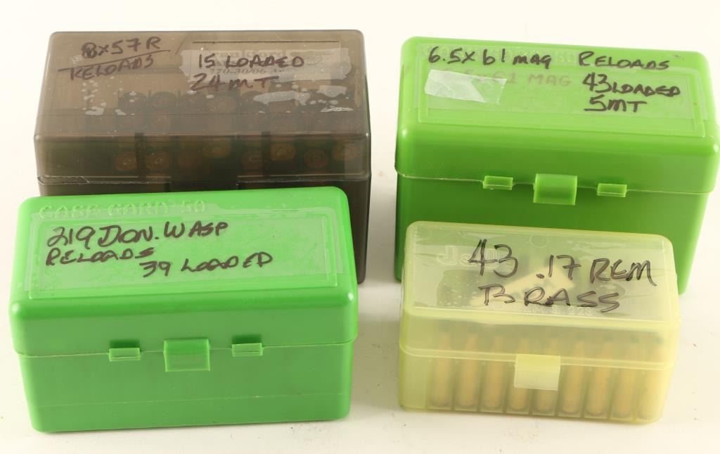 Including 15 reloads and 24 empty brass rds for 8x57R, 43 rds of .17 REM brass, 43 reloades and 5 brass for 6.5x61 Mag, and 39 Don Wasp reloads for .219.