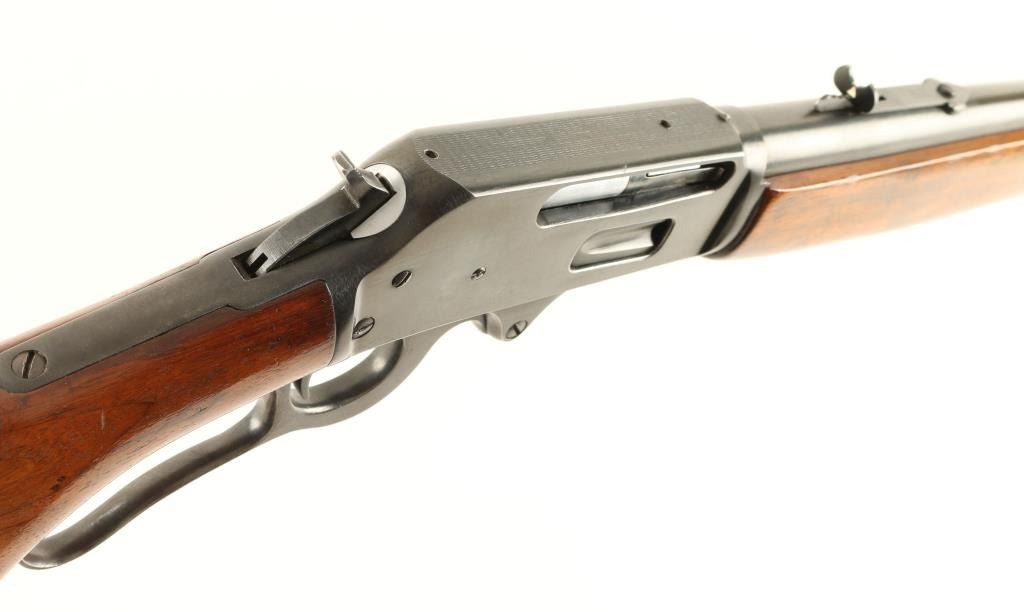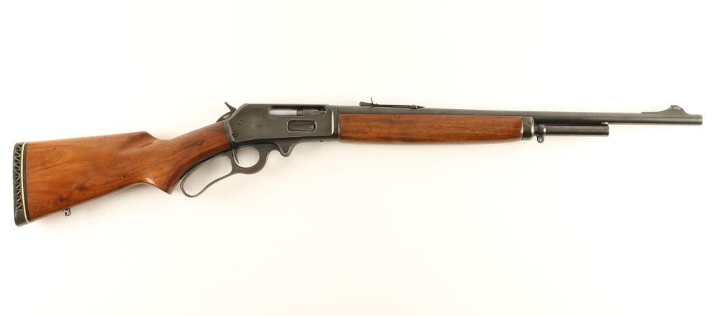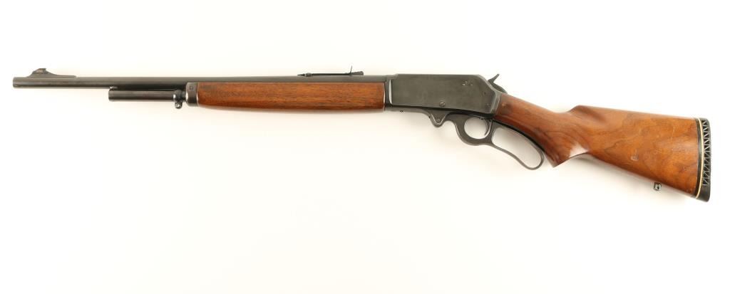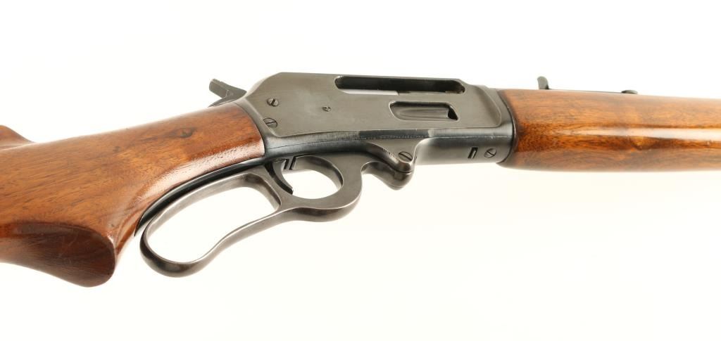 Tube fed lever action sporting carbine chambered in .30-30 Winchester. Features a blued finish, 20" barrel, 3/4 tube magazine, ramped blade front sight with gold bead, adjustable rear sporting sight, drilled & tapped receiver, smooth trigger, partially serrated hammer spur, swivel studs, smooth wood forend with metal cap and pistol grip shoulder stock with rubber recoil pad. The finish on the barrel is turning to a grey/brown patina while the receiver retains most of it's bright blued finish showing light wear. Overall approximately 60%-70% finish is intact. Action is smooth, bore is bright and wood stocks are very good. Condition is good to very good. ***Modern Firearm***