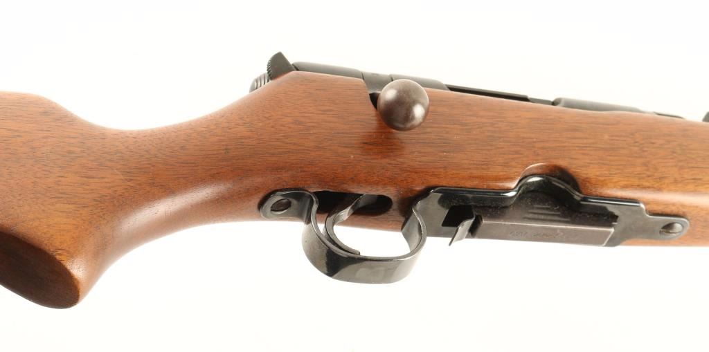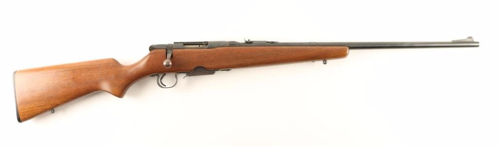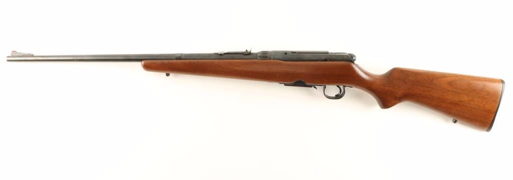 Bolt action sporting rifle chambered in .222 Remington. Features a blued finish, 24" tapered barrel ramped blade front sight with brass bead, adjustable rear sight, detachable box magazine, serrated trigger, manual safety, swivel studs and one piece walnut pistol grip shoulder stock with serrated black plastic buttplate. Rifle exhibits 90% of it's original finish with some small losses, light scratches and light surface rust forming on the receiver. Action is smooth, bore is excellent and wood stock is fine. Condition is very good. ***Modern Firearm***