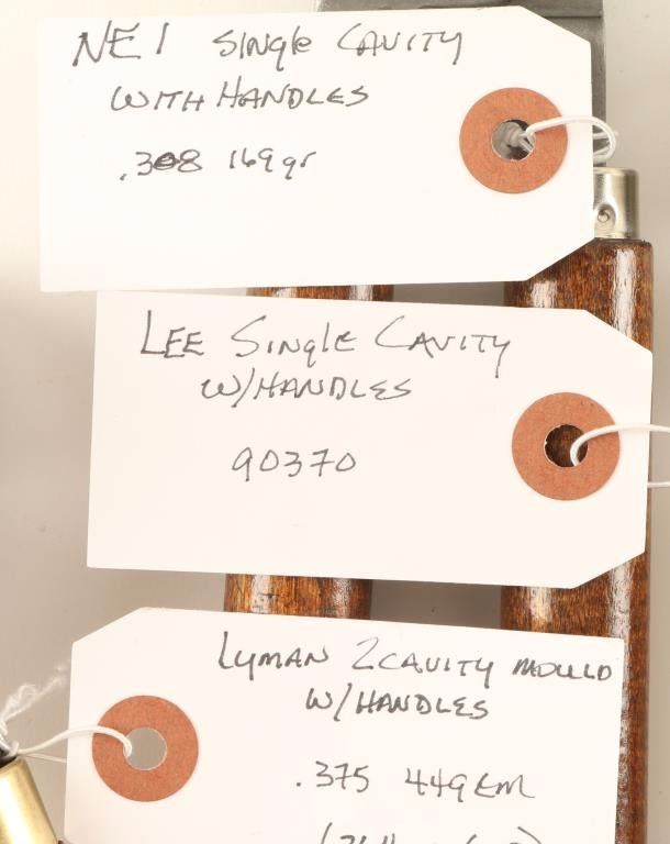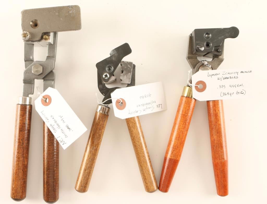 Includes a Lee single cavity 90370 with wooden handles, an NEI single cavity .308 - 169gr with wooden handles, and a Lyman 2 cavity .375 - 449EM with wooden handles.