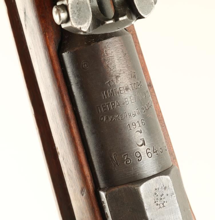 Arsenal reconditioned Russian bolt action service rifle chambered in 7.62x54R, circa 1916. Features a blued finish, 31.6" barrel, blade front sight, ladder rear sight, 5 round internal box magazine, sling swivels, hex receiver, Tula "Peter the Great" Imperial marking, straight bolt handle, smooth wood handguard and full length straight grip shoulder stock with metal buttplate. Matching serial numbers on barrel & receiver. Import marks on barrel. Finish is approximately 70% intact with heavy wear on the exposed portion of the barrel near the muzzle. Action performs well, bore is dark with good rifling and wood stock is good+. Condition is good. ***C&R Firearm*** ***Modern Firearm***