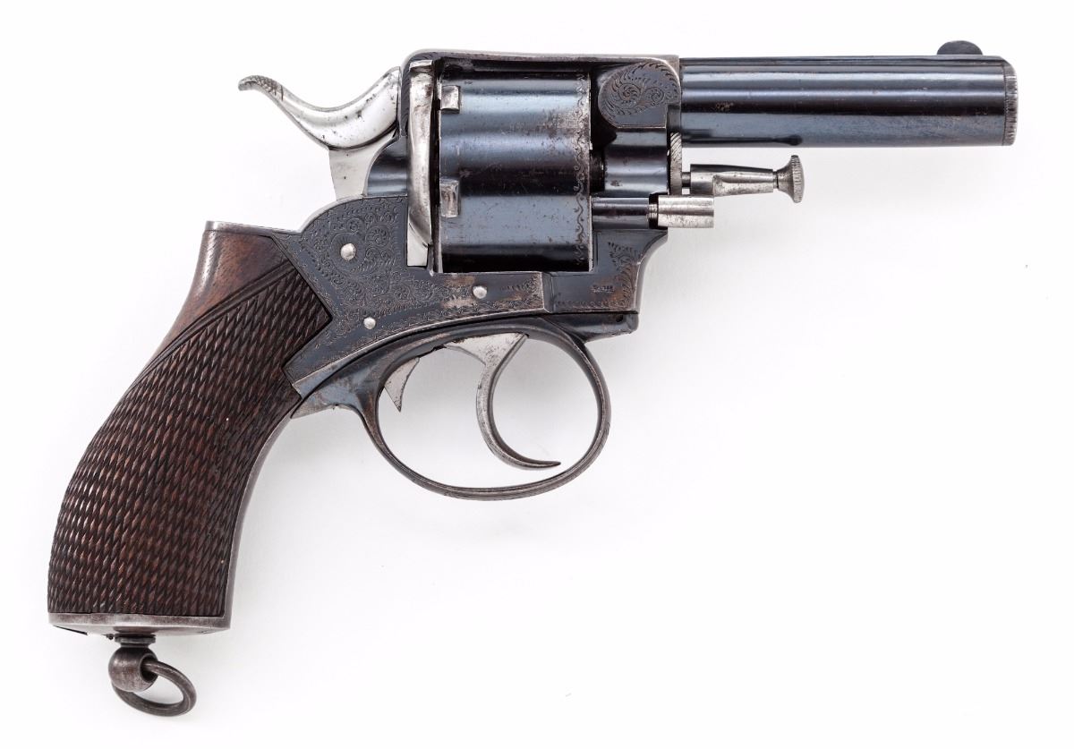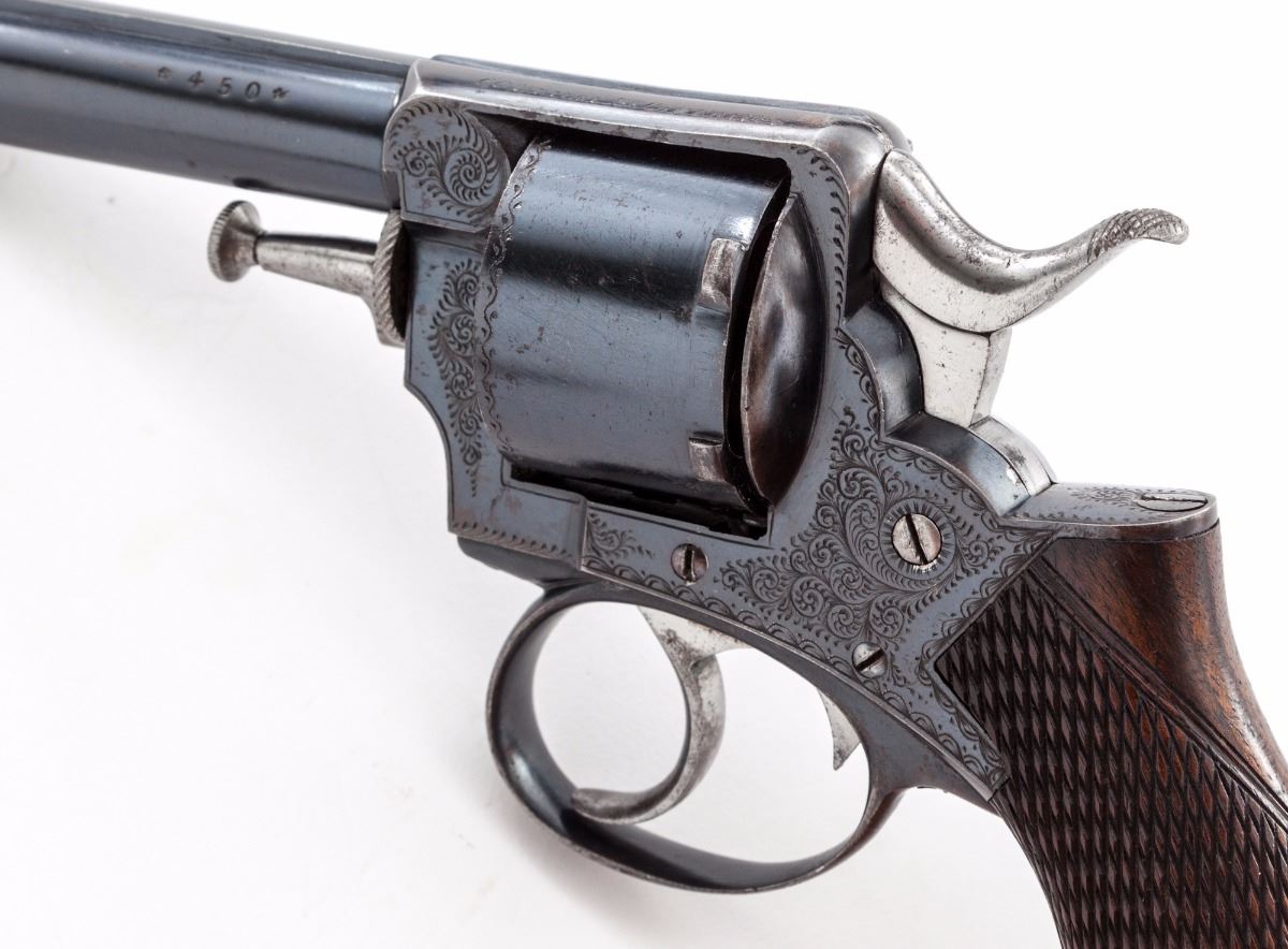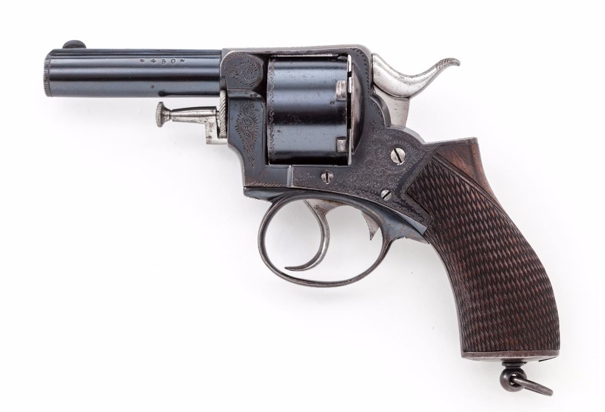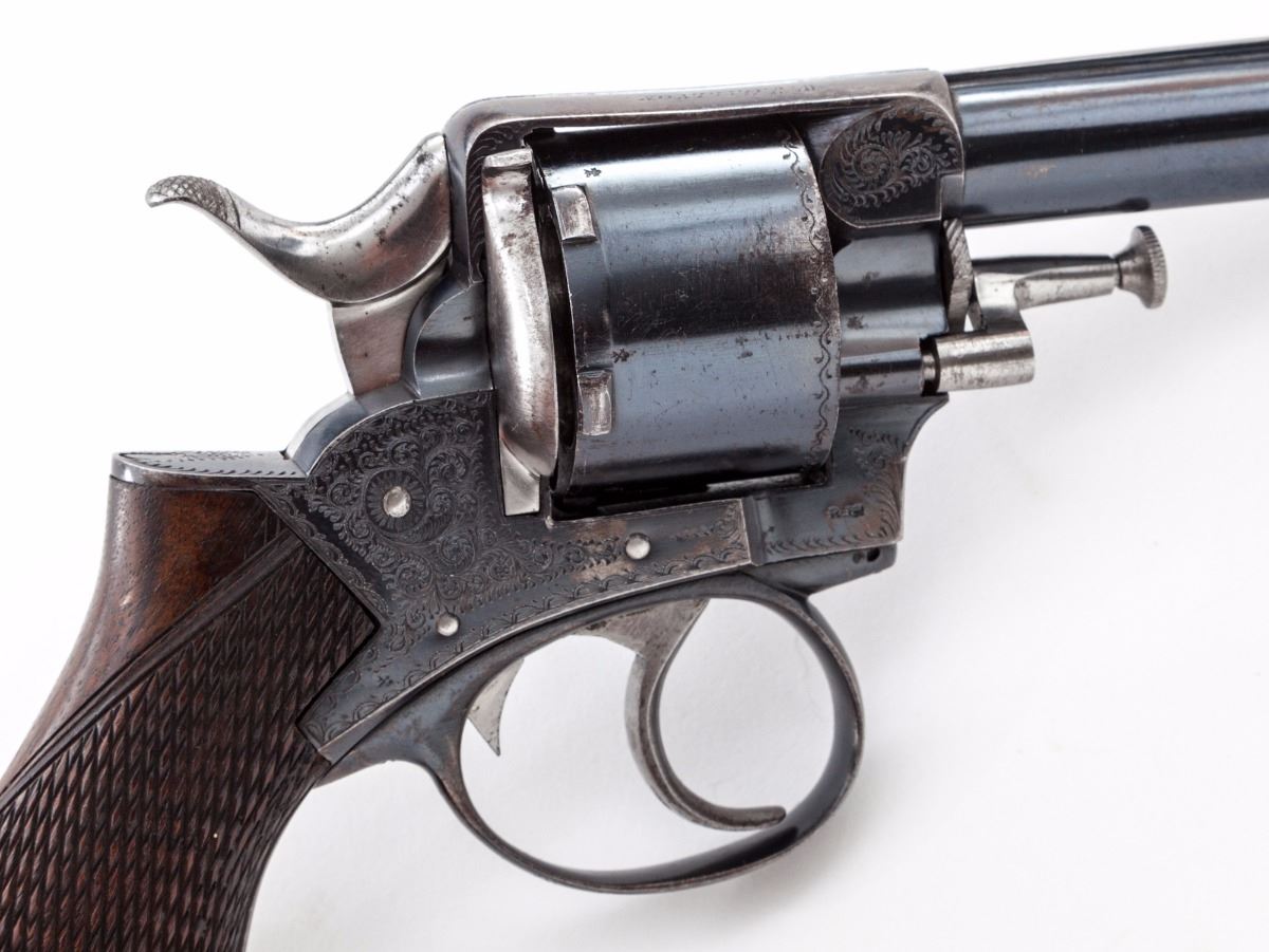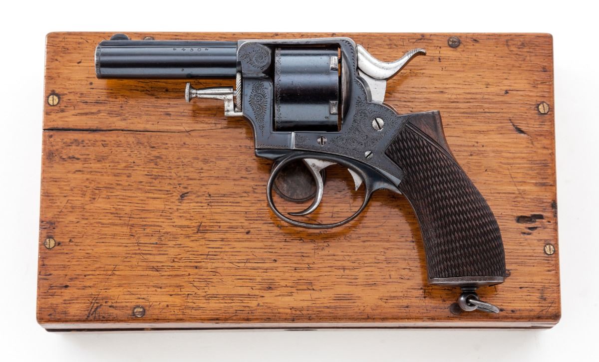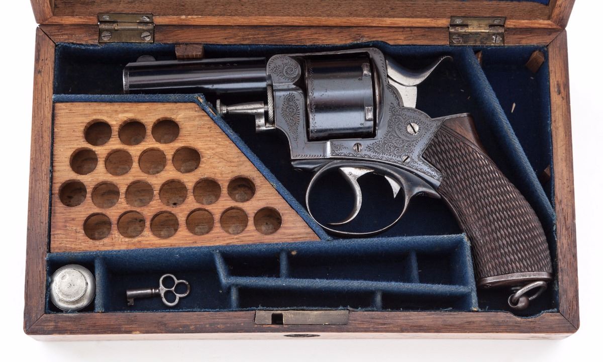 Cased Banknote Engraved English Bull Dog Double Action Revolver, marked ''W.J. Gallyon'', #1754, .450 cal., 3-1/2'' barrel, 6-shot non-fluted cylinder, one-piece checkered walnut grips with lanyard loop in butt. Oak case features cartridge block, oiler, key and Gallyon trade label in lid. Condition to revolver is fine retaining approx. 92% blue, with toning to top strap and to right side of frame above triggerguard. Grips with mild flattening. Action is good, bore is bright. Case is missing one triangular interior lid, with some fraying to blue baize interior. Exterior of case has warped somewhat and is missing brass escutcheon to key hole. Est.: $1,200-$1,800. (Antique)