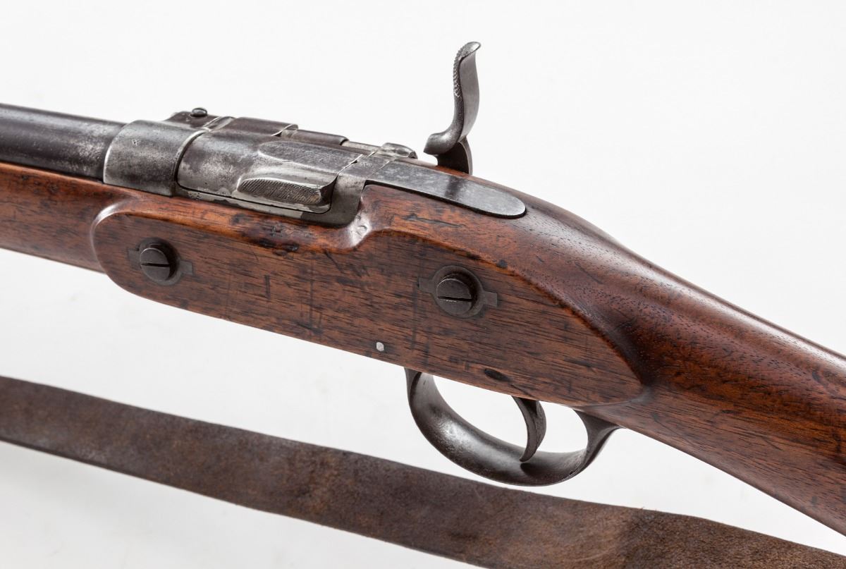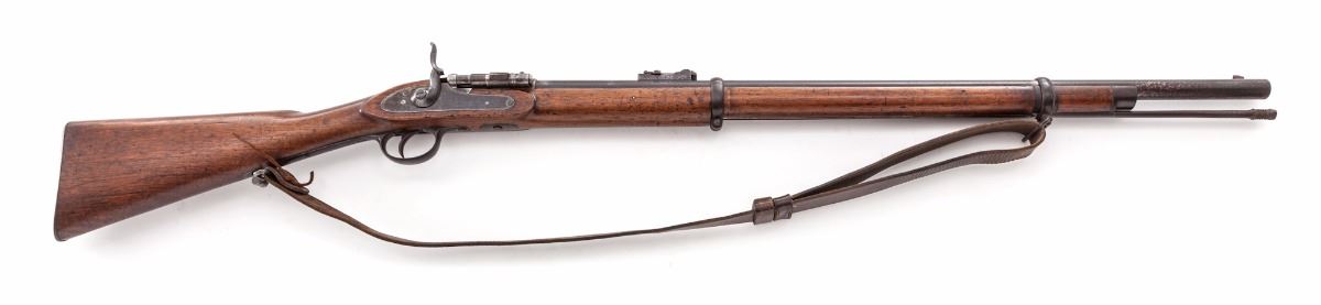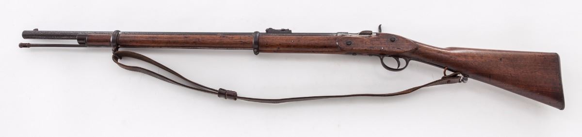 Enfield Model 1852 Officer's Carbine, by Henry Egg, London, #18, .577 cal., 30.5'' barrel, blue finish, top of breech hand engraved ''No. 18/Newark's Converted Enfield''; lockplate marked ''H. Egg/London''; iron triggerguard and buttplate, with standard sights, ramrod and leather sling. Condition is very good to near fine with light even patination as mild pitting and moderate toning. Stock may have been sanded at one point, but only lightly; light scuffs, scratches and oil darkening are present. Breechblock was mfg'd without locking latch and opens on the half-cock. Action is good, bore is fine to excellent. Est.: $2,000-$3,000. (Antique)