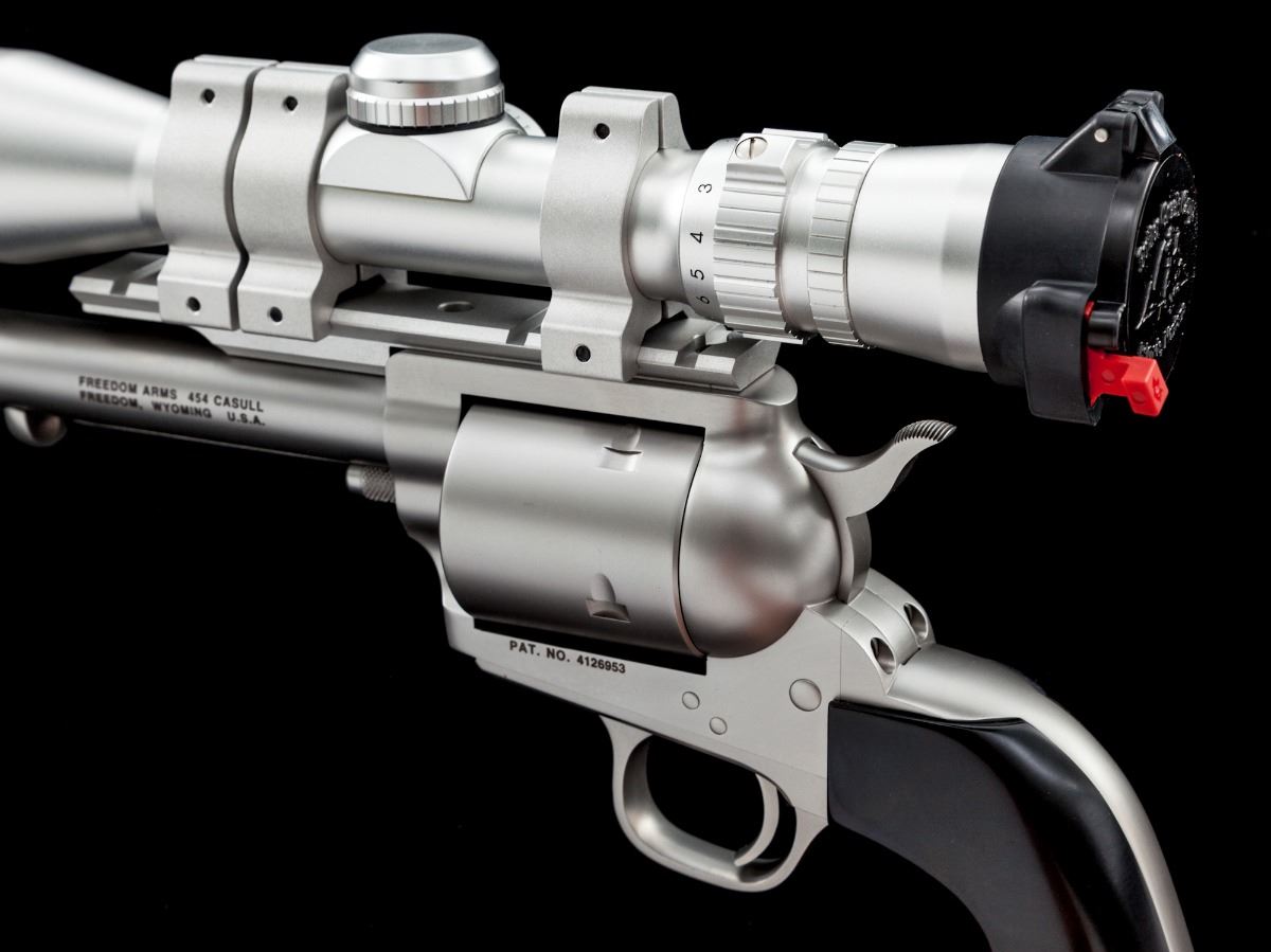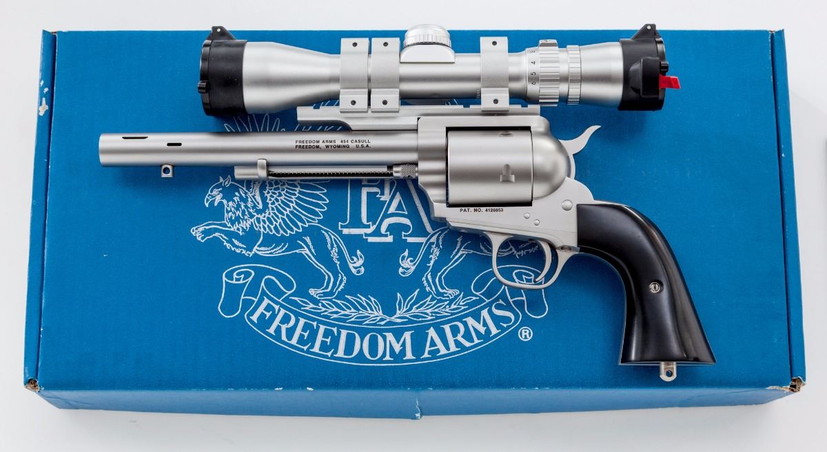 Freedom Arms Model 83 Premier Grade Single Action Revolver, #DMSNSHFT2, .454 Casull cal., 7-1/2'' ported barrel, brushed stainless finish, black composite grips, and sling swivel studs. Topped with a Bausch & Lomb Elite 3000 scope. In original box with matching end label, paperwork, sling, and an additional .45 Win. mag. cylinder. Condition is excellent, appearing near new, showing only minimal signs of handling. The .454 cylinder with a faint dragline; the .45 Win. mag. cylinder with no dragline. Sling is still in the original plastic packaging and appears to have never been attached to the revolver. Action is crisp, bore is mirror bright, scope optics are clear. Est.: $1,800-$2,400. (Modern/PPT)