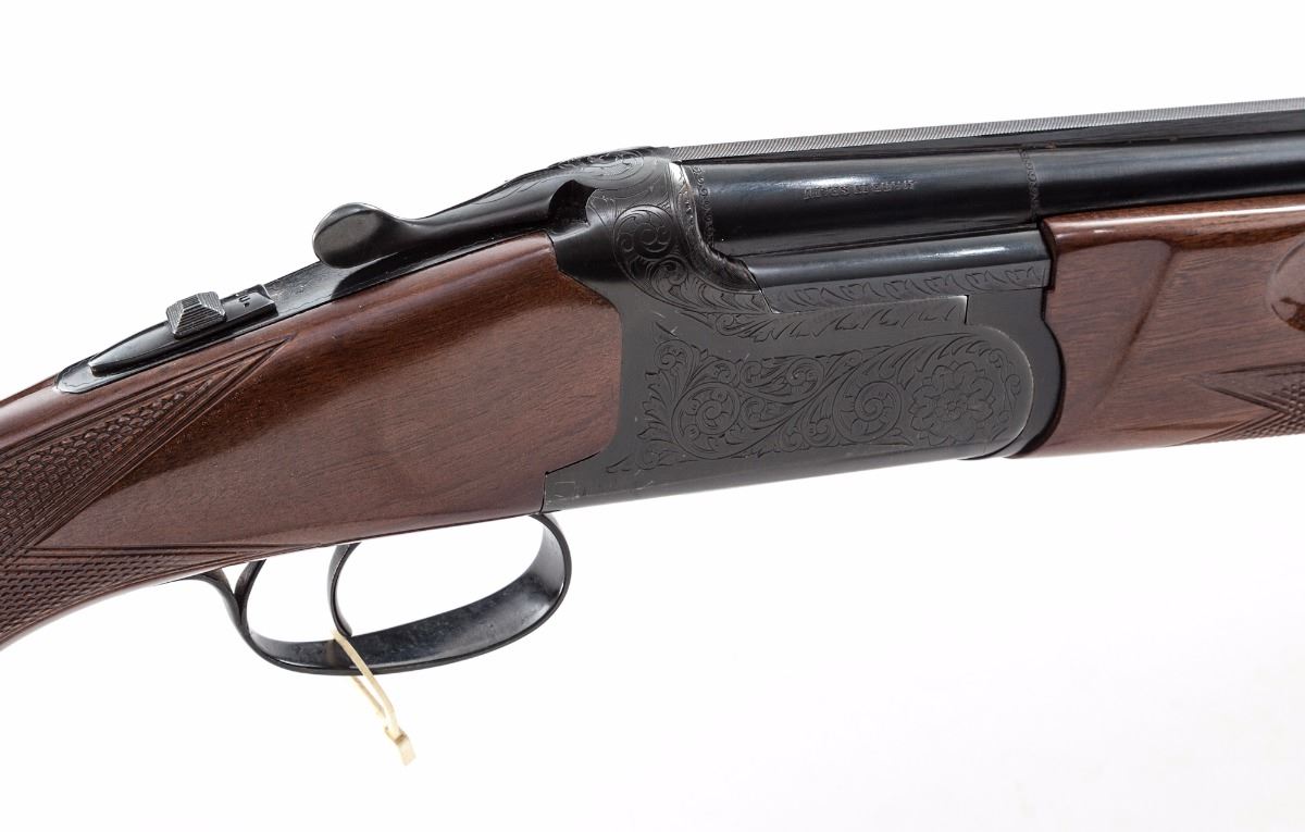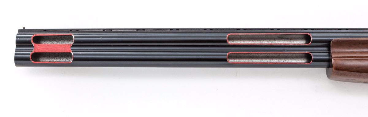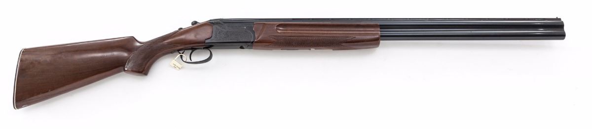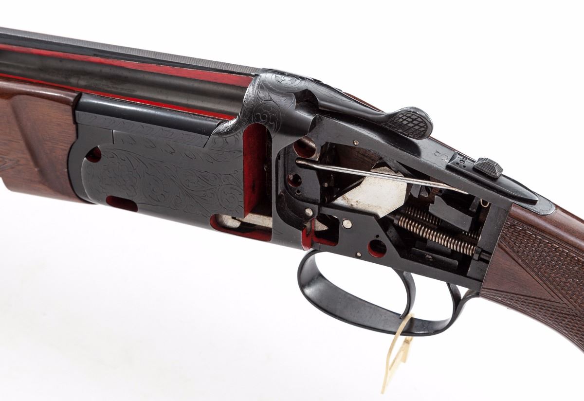 Lanber Ibargun Factory Cutaway Over/Under Boxlock Shotgun, #IG120609, 12 ga., 2-3/4'' chs., 27-1/2'' vent rib barrels with front brass bead, Full/Mod. chokes, extractor and automatic top-tang sliding safety; bright blue finish frame and barrels with red highlighted cutaway borders. Gloss finish checkered walnut pistol-grip stock and fingergroove forend. Length of pull is 14-1/8'' to a black plastic buttplate. The gun can be taken down as normal and is especially useful for demonstrating the cocking levers and inertia trigger set-up in a typical over/under boxlock mechanism. Attached to the triggerguard is a ''SHOT SHOW 1980'' plastic tag. Condition is good with overall blue wear and scratches from handling. Unfinished white metal parts have light oxidation. The toe line of the stock has a 4'' split forward from the buttplate screw. Est.: $500-$750. (Modern)