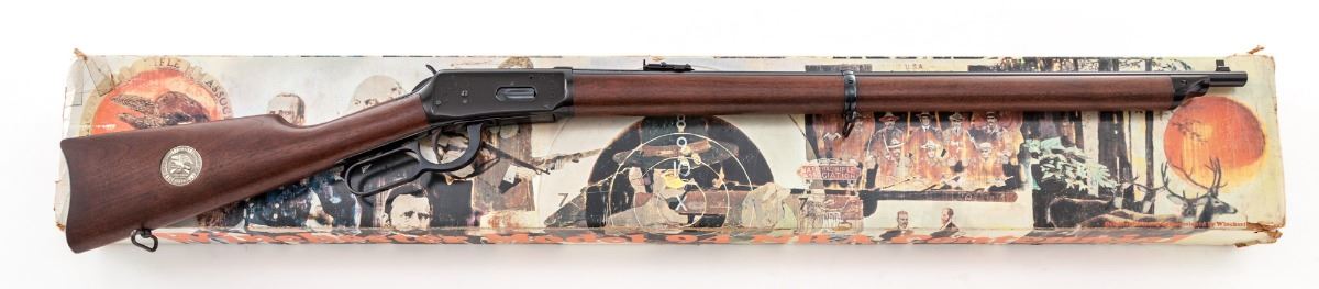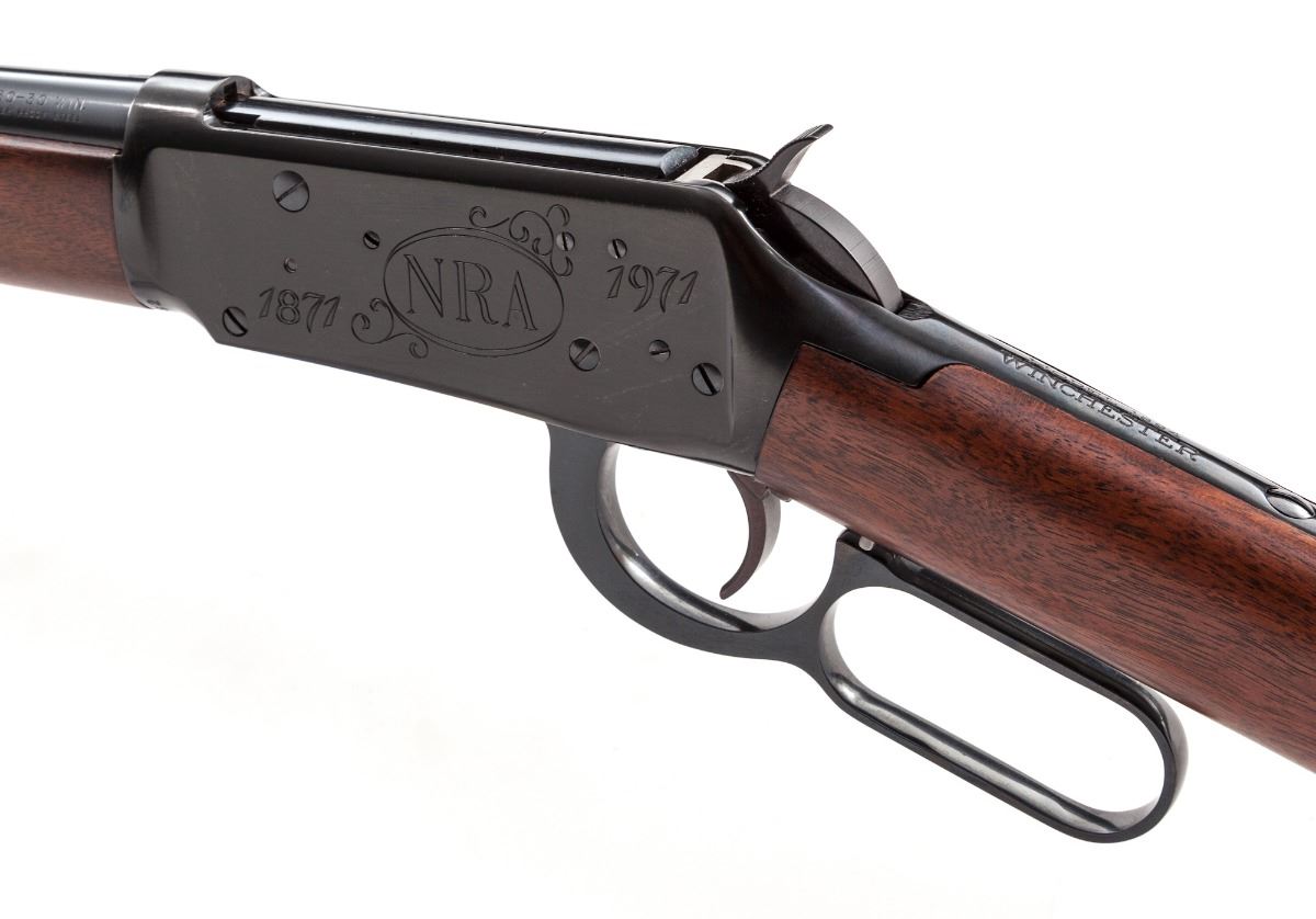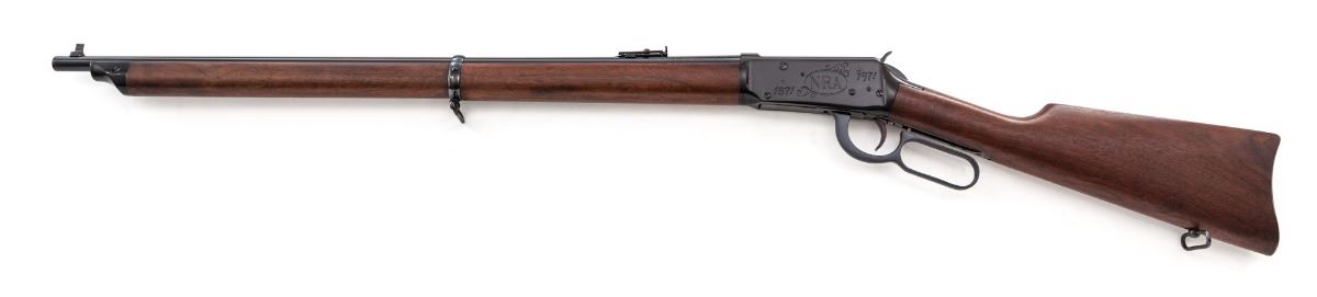 Commemorative Winchester Model 1894 NRA Centennial Lever Action Musket (1871-1971), #NRA23162, .30-30 cal., 26'' round barrel, dark blue finish with light engraving, left side of frame reads ''NRA 1871-1971''; straight smooth walnut stock with inlaid NRA Centennial medallion, blade front sight, folding rear sight, with sling swivels. In original box with polychrome slipcover, original Certificate of Authenticity, and misc. paperwork. Condition is excellent, appearing as new, with only a few light marks from handling. Slipcover shows some wear and separations at corners; end label is only partially visible. Est.: $600-$800. (C&R)
