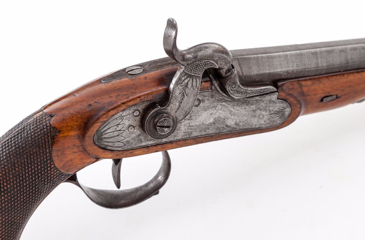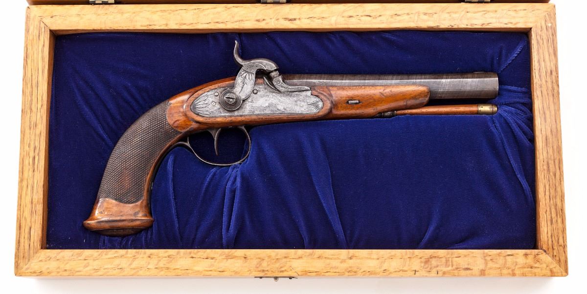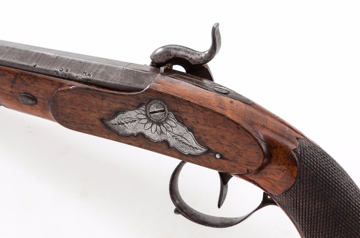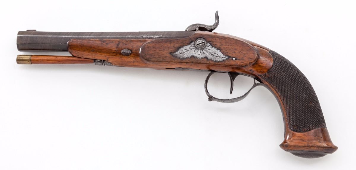 Belgian Percussion Target Pistol, NVSN, brass sleeved .44'' bore with 3-groove rifling, reduced from an original .58'' smoothbore, browned 6-1/2'' octagonal twist barrel with small notch rear sight and square front blade, upper left barrel flat is marked ''58'' and ''44'' above a single Liege proofmark. Lockplate and furniture are lightly engraved with leaf patterns and hammer has a half-cock notch; checkered stock has a gloss varnished finish with metal grip cap and tapered wood ramrod with a brass ferrule; weight is 27 ozs. In modern oak case lined with blue velour. Condition is fair to good with a strong mainspring and clean bore. Metal surfaces have a dark grey patina with fine oxidation and pitting. Barrel has a few chafes and the hammer has areas of buffed corrosion. Stock has small dents and chips with raised grain and a beginning split under the forend. Front sight is an inset replacement. Est.: $500-$750. (Antique)