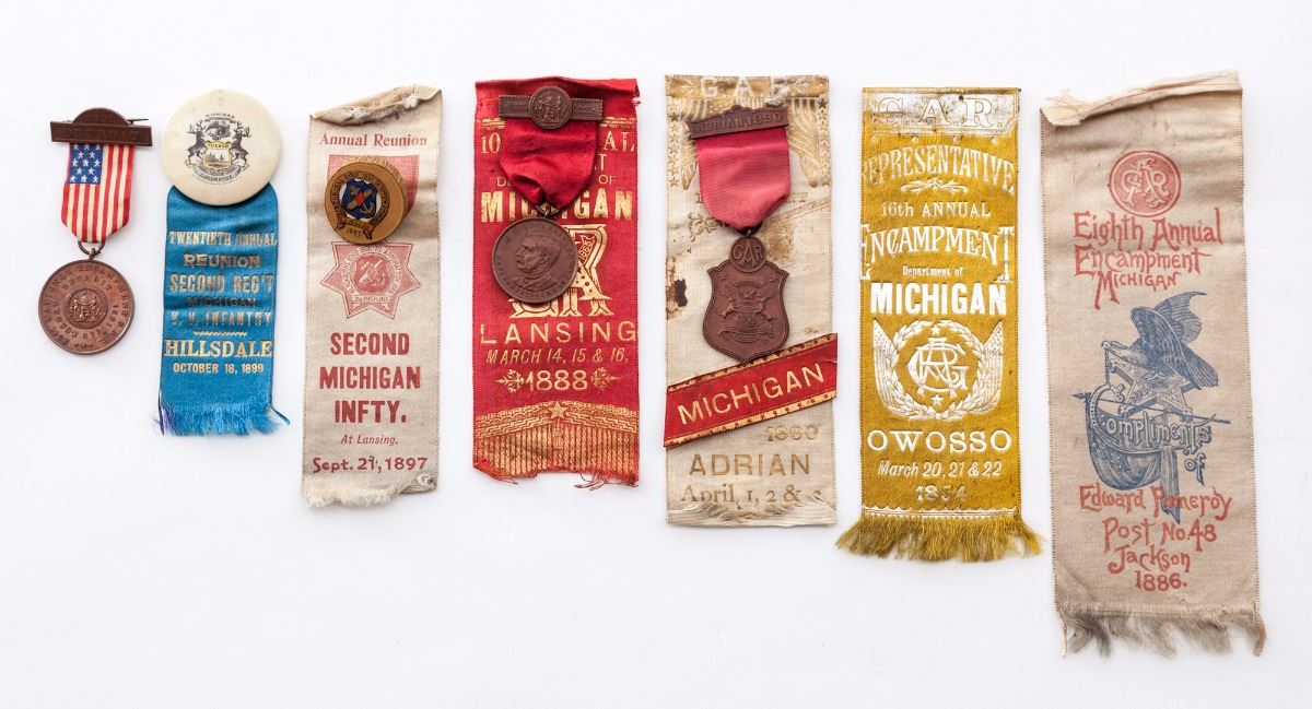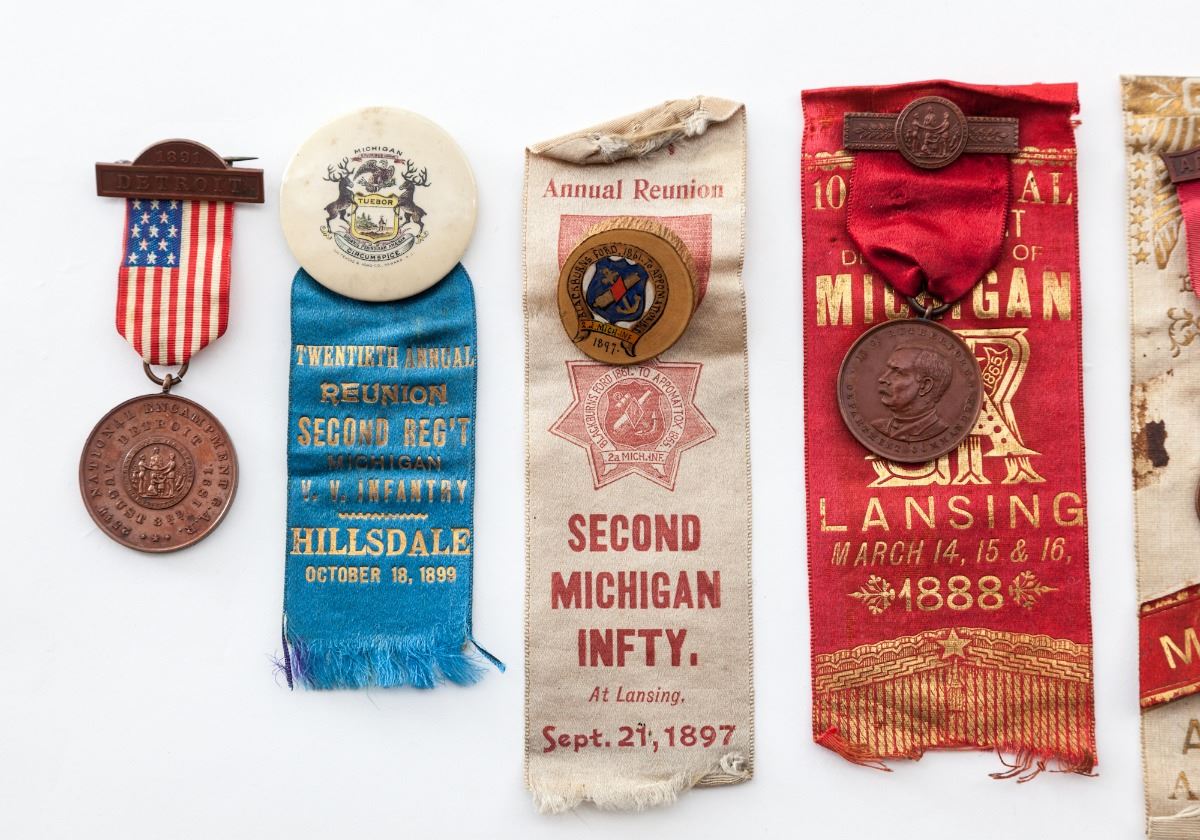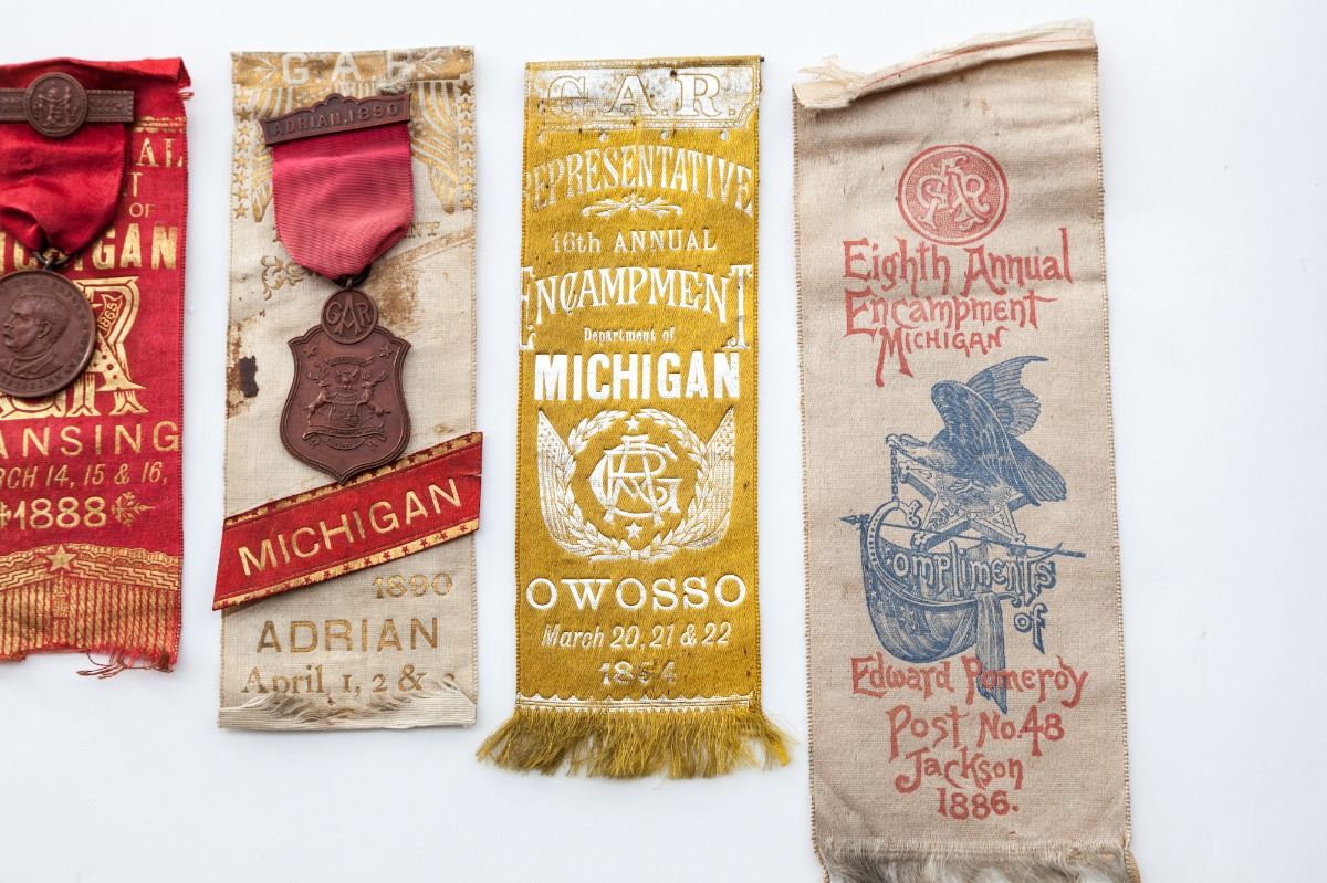 Lot of Seven (7) late 19th Century Michigan State GAR Badges and Ribbons: (1) 1888 dated Lansing, Mich. 10th Annual Encampment ribbon with medal, with L.G. Rutherford, Dept. Commander medal and original C.S. Cole maker's label on reverse. (2) 1890 dated 12th Annual Adrian, Mich. Encampment ribbon with medal: white ribbon with gold lettering, and red/gold Mich. banner that holds Coat of Arms medal in place. Back of medal reads ''Compliments of Woodbury Post 45''. (3) 1891 dated Detroit 25th Encampment medal with American flag ribbon; back reads ''Post 2 Philadelphia''. (4) 1899 dated 20th Annual Hillsdale, Mich. 2nd Regiment Infantry badge, celluloid button with Mich. Coat of Arms, blue ribbon with gold lettering. Both with Whitehead & Hoag Co. maker's label to reverse. (5) 1897 dated 19th Annual 2nd Lansing, Mich. Infantry badge, with attached wood button with 2nd Inf. insignia painted on front. (6) 1886 dated 8th Annual Mich. Encampment ribbon, part of which reads ''Edward Pomeroy, Post No. 48, Jackson, 1886''. Includes eagle and flag decoration. (7) 1894 dated 16th Annual Owosso, Mich. Encampment representative ribbon. Reverse with C.S. Cole maker's mark in silver lettering. Conditions range from good to fine overall. White ribbons with light discoloration. 1890 Adrian badge with detached banner. Others with minor fraying commensurate with age. Est.: $300-$500/lot.