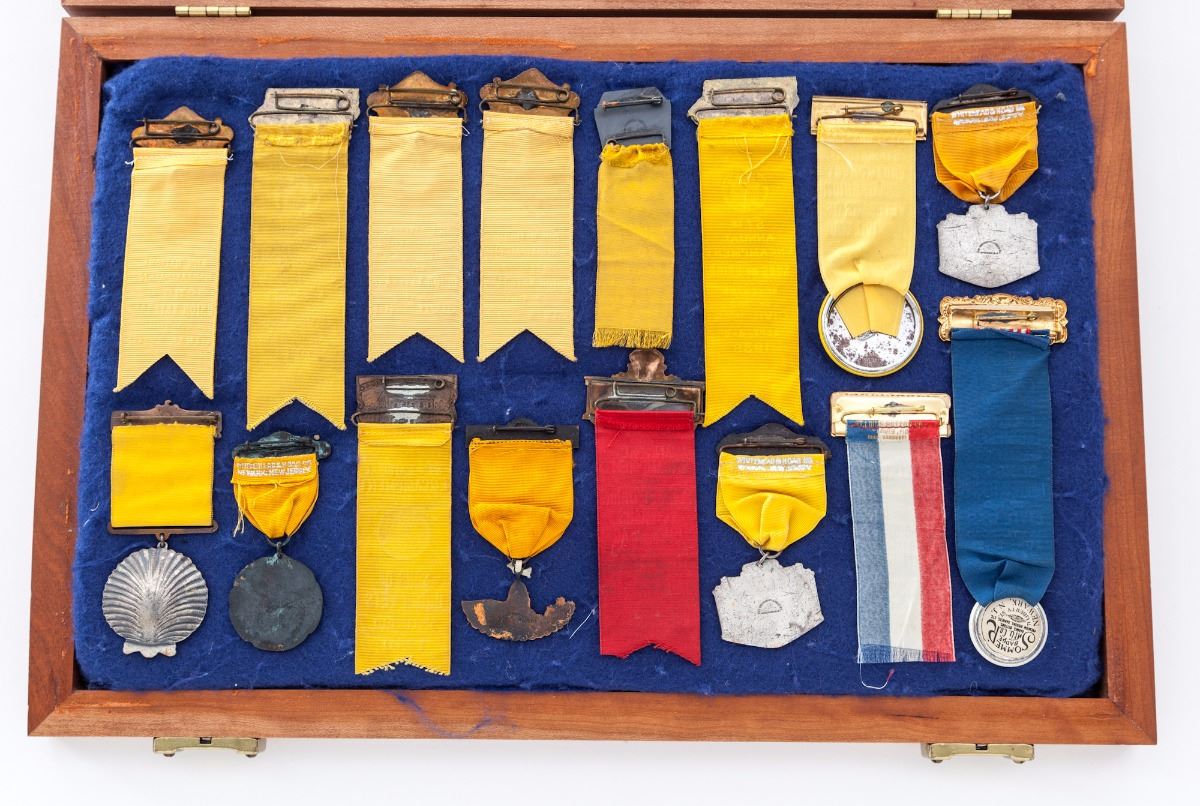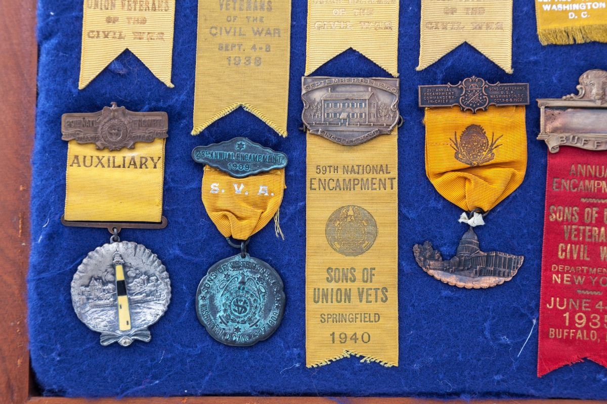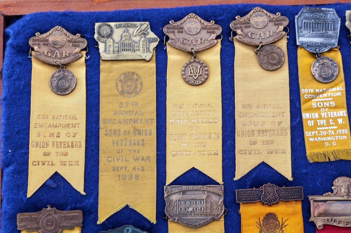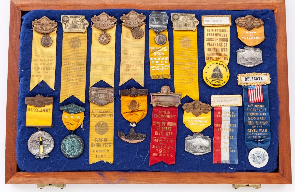 Lot of Sixteen (16) Sons of Union Veterans of the Civil War Encampment Badges, all with suspension bars and ribbons, some with additional badges. Dates range from 1909 to 1956, with most dating from the '30s to the '40s. States include Ohio, Iowa, PA, Tennessee, Vermont, Colorado, etc. Two suspension bars with hand-applied names, one Edna Bergwitz and the other E.C. Skinner. Condition to all is about fine. Some ribbons with light fraying and discoloration. One medal and suspension bar with moderate verdigris present. Est.: $250-$450/lot.
