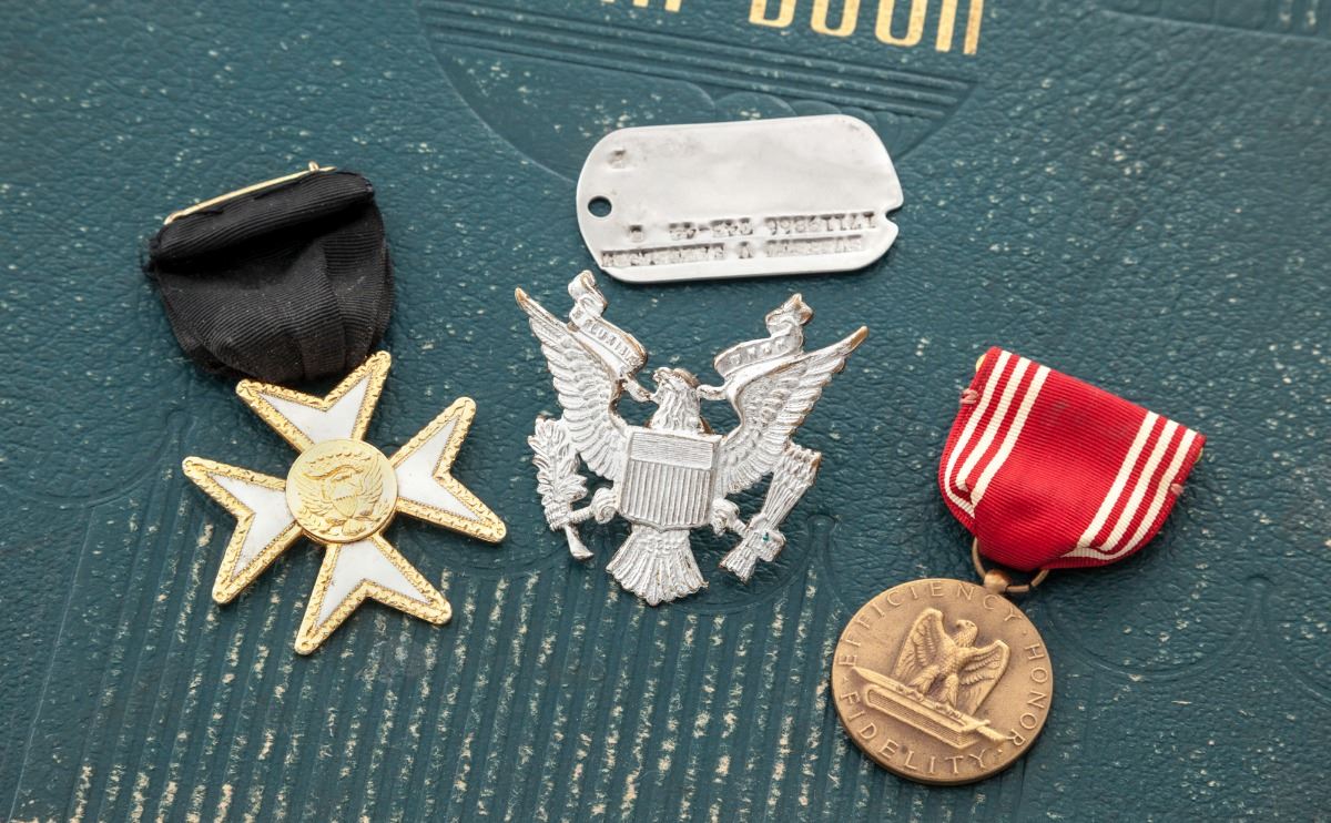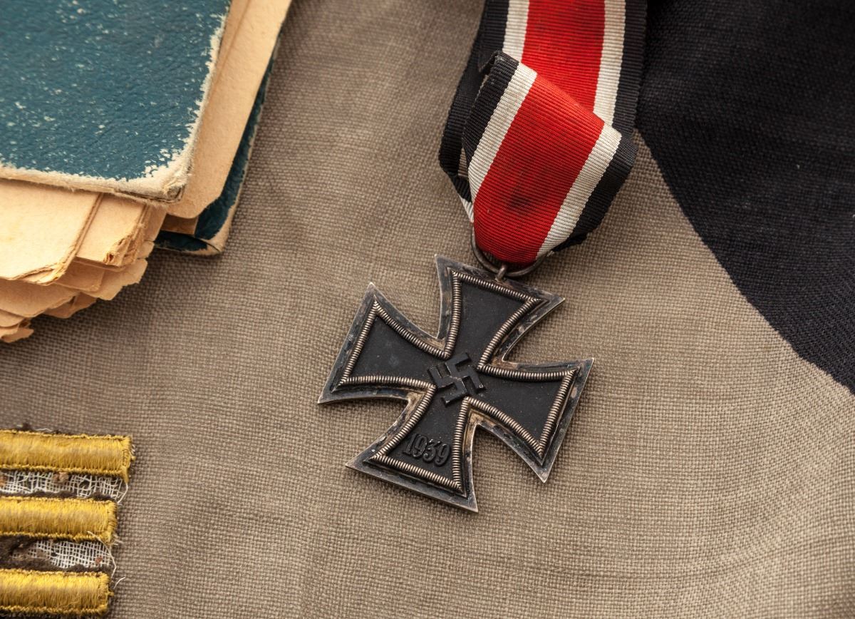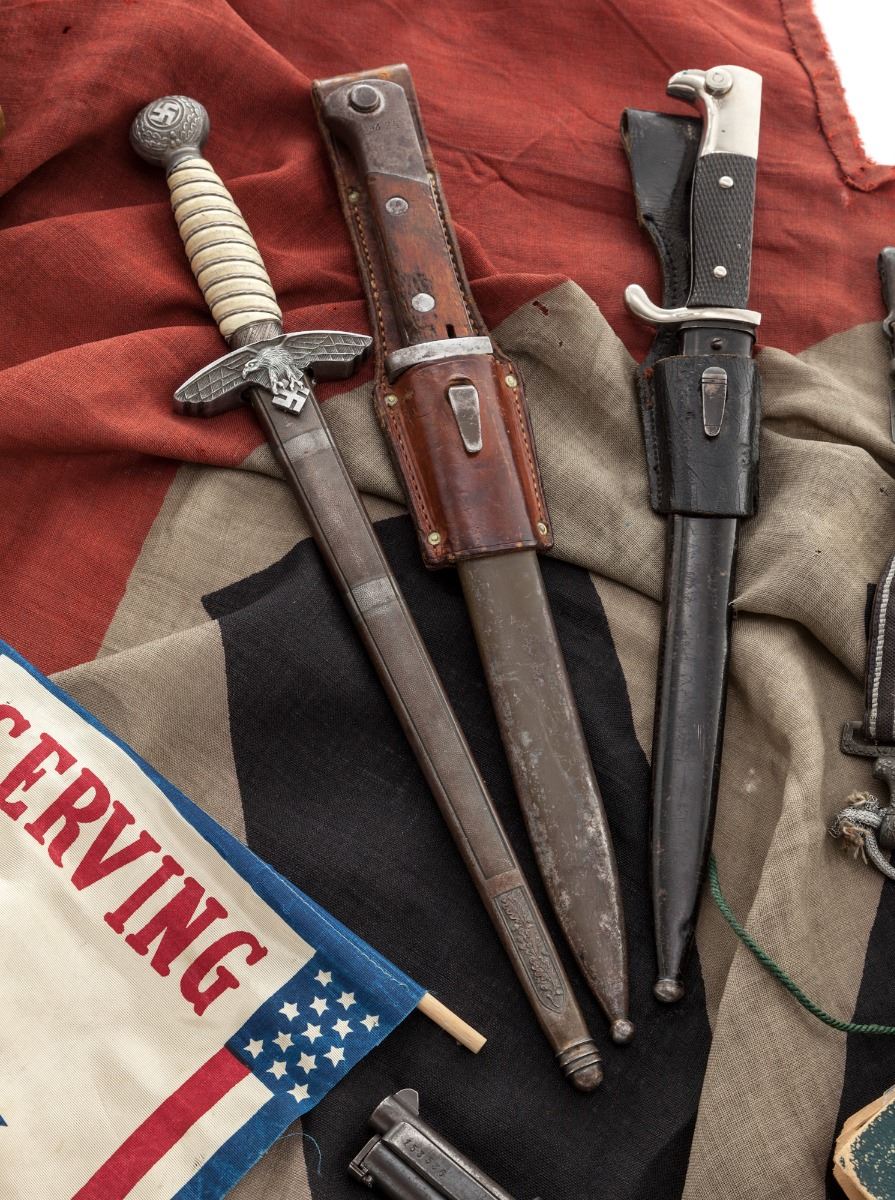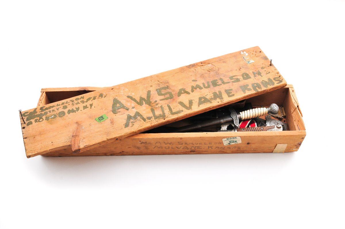 Lot of WWII Bring-Back Souvenirs: (1) Mauser Model 1910 Semi-Automatic Pistol, #153536, .32 ACP cal., 3-1/4'' barrel, walnut grips, no mag. Condition is very good retaining approx. 75% blue. Grips with smoothing. Action is good, bore is fair. (2) Period photo scrapbook with approx. 90 photographic images taken in the European Theater of Operations of Cpl. Everett Samuelson, whose discharge and bring-back documents are included. (3) Late war Nazi banner-type flag measuring approx. 5'x5-1/2' with tatters along one edge, as well as soiling from 70 years of storage. (4) Single star storefront window banner. (5) Four German and axis bayonets with leather scabbards. (6) One German officer's dress dagger with hanger and portapee, needing some repair. (7) Nazi police kepi front insignia. (8) Two variations of Reichsbahn belt buckles. (9) One German infantryman's belt buckle. (10) Iron Cross 2nd Class with ribbon; American Good Conduct medal; several American service ribbons; one of Samuelson's dog tags. (11) 1943 dated 57mm artillery shell casing. All are in their original wooden crate that Cpl. Samuelson mailed home to his father in Mulvane, KS at the end of WWII. Address and return address are handpainted in olive drab paint. Condition to all items is good to very good. Est.: $1,000-$1,500/lot. (C&R/PPT)