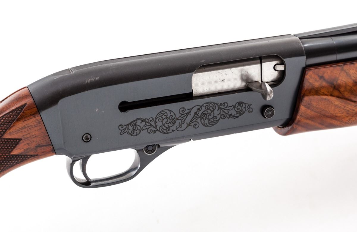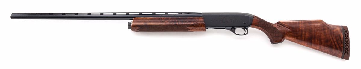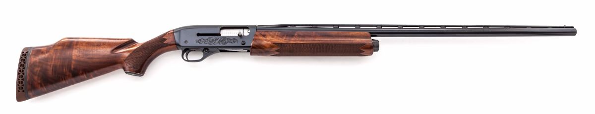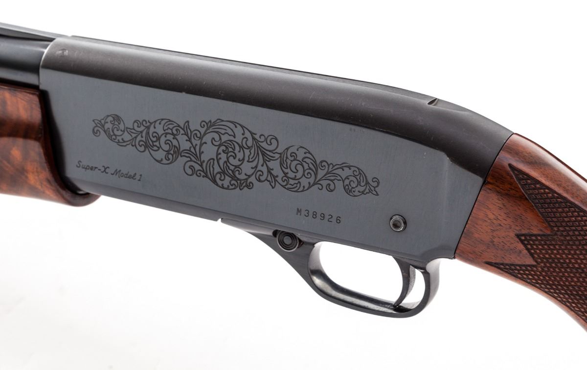 Winchester Super-X Model 1 Semi-Automatic Trap Shotgun, #M38926, 12 ga., 2-3/4'' ch., blue finish, 30'' barrel with matted 3/8'' ventilated rib, white Bradley front bead and middle steel bead, with Improved Modified trap choke; receiver has impressed scroll designs on both sides, with engine-turned bolt, and triggerguard mounted push-button safety; checkered pistol-grip Monte Carlo stock and target forend are AA Grade dark figured walnut finished in a semi-gloss with Winchester pistol grip cap. Length of pull is 14-3/4'' over a 1'' brown Pachmayr Competitor recoil pad; drop at comb is 1-3/8'', drop at MC is 1-3/8'' and drop at heel is 2-1/4''; weight is 8-5/8 lbs. Mfg'd ca. 1979. Condition is near excellent, showing moderate use, with a bright bore. Receiver and stock show a few small handling marks. Est.: $600-$800. (Modern)