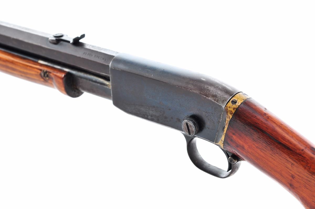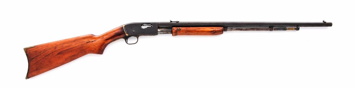 Remington Model 12-CS Slide Action Rifle, #634926, .22 Rem. Spec. cal., 24'' barrel, blue finish, two-piece walnut stock, blade front sight and adjustable leaf rear sight. Condition is poor, with dark brown patina to all metal surfaces and scattered corrosion. Action does not function, bore is dark. Est.: $75-$150. (C&R)